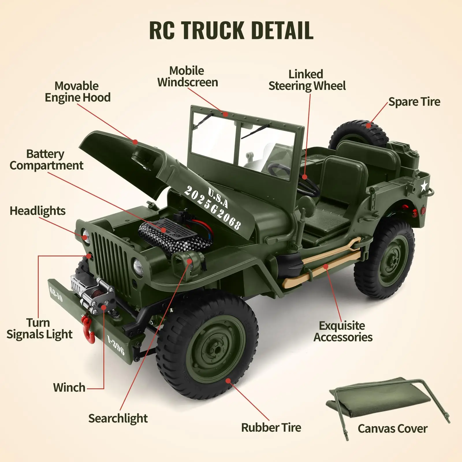 Keys features of this military RC jeep