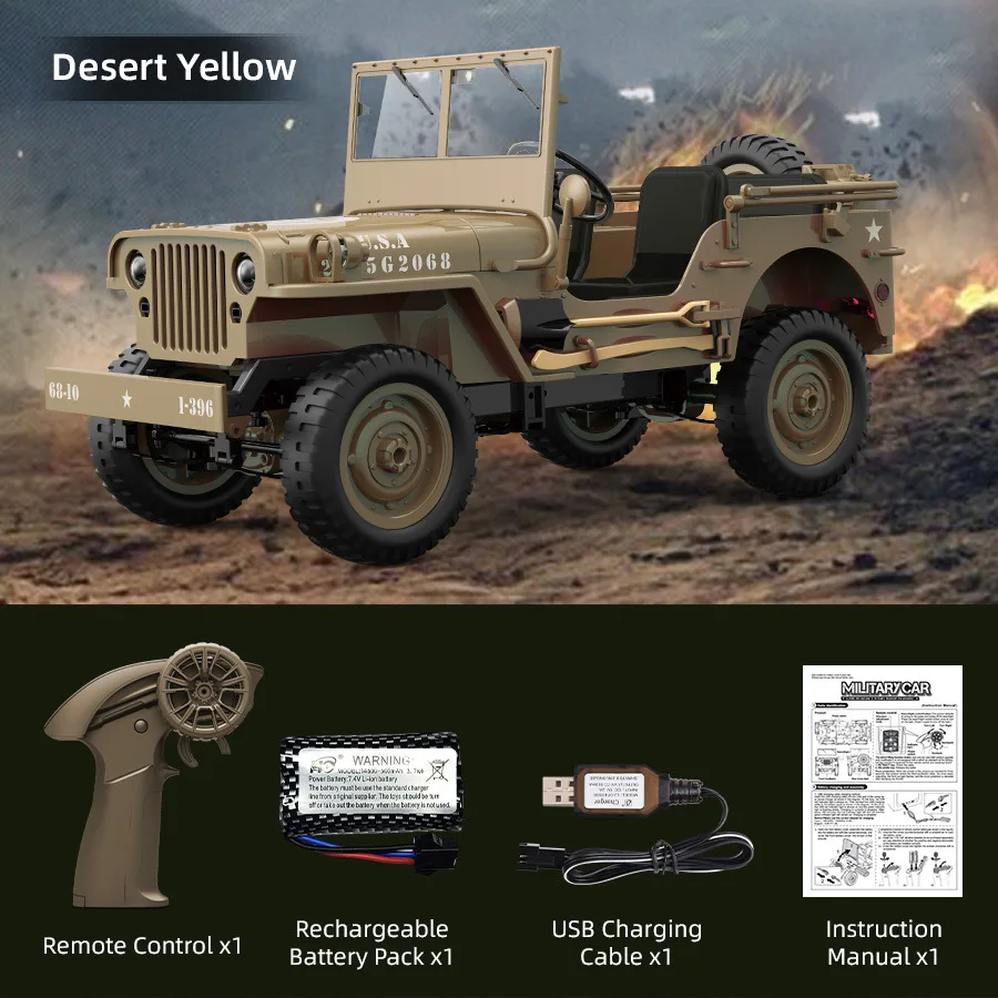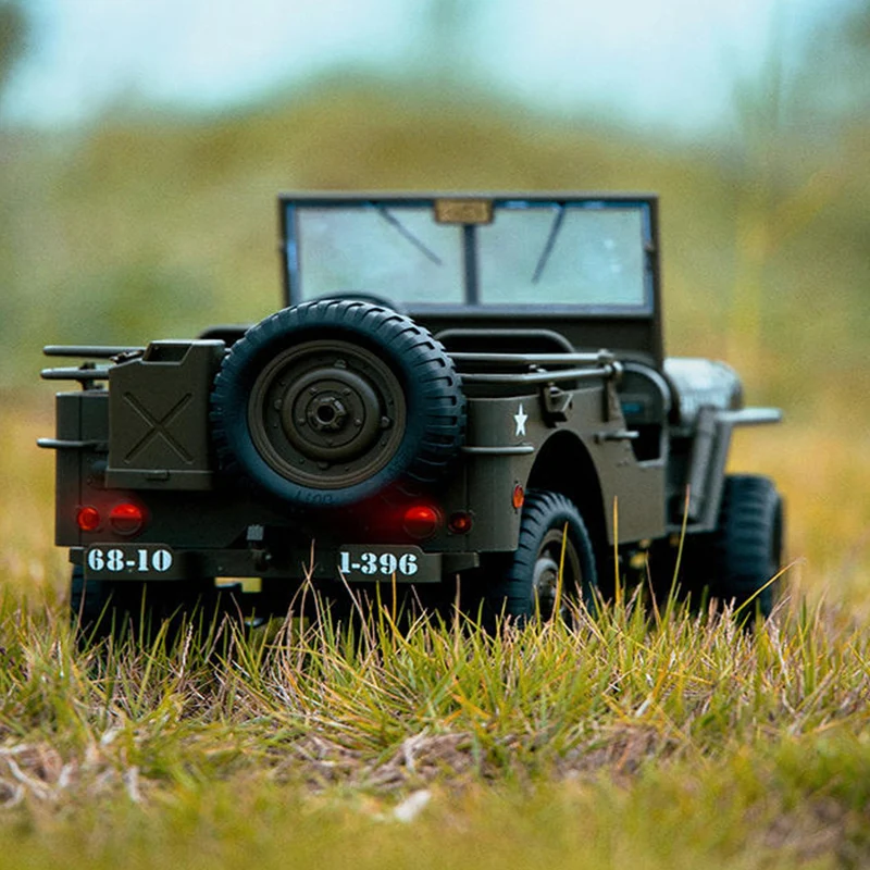 Experience the thrill of driving this highly detailed military-inspired off-road RC vehicle, designed to emulate a classic Jeep with authentic style and rugged appeal. Featuring a matte, dark green finish with white stenciled markings such as “U.S.A” and a white star emblem, it truly captures a vintage military aesthetic. Its textured surfaces, rivets, hinges, and panel lines add to the realism, while the large, deep-tread tires and visible metal bolts reinforce off-road capability. Equipped with realistic LED headlights, taillights, turn signals, and adjustable searchlights, this RC truck not only looks impressive but also offers functional lighting. Its interactive accessories, like a painted shovel, axe, spare tire, and fuel tank, provide extra play and customization options. This vehicle is perfect for collectors seeking durability, detail, and adventure.