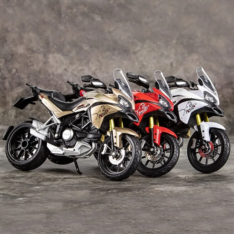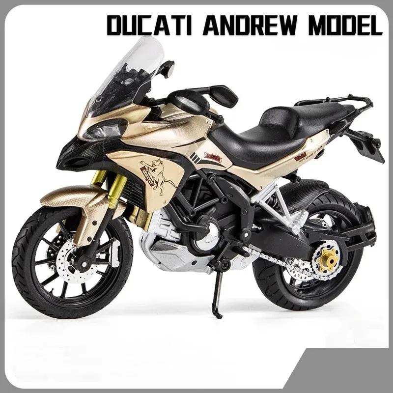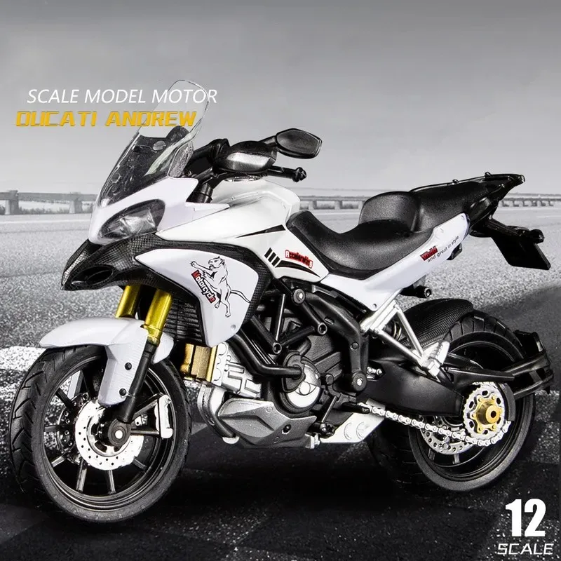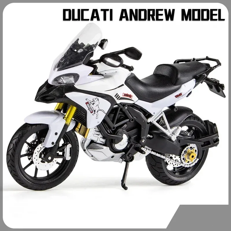 Experience the thrill of off-road adventures with this expertly crafted 1/12 scale Ducati MTS Enduro diecast model. Designed with precision, it features a realistic appearance with white, red, or gold finishes, perfect for collectors or enthusiasts. Its rugged styling includes detailed alloy and plastic components, a black seat, and authentic frame accents. The front fairing boasts a clear windshield, complemented by black mirrors and control handles. Gold-colored front suspension forks add sporty flair, while detailed tires and brake discs enhance realism. The muscular engine components and off-road features like a fork shock absorber make this model an eye-catching display piece or a durable toy. Whether as a gift or display item, it captures the essence of rugged motocross design.