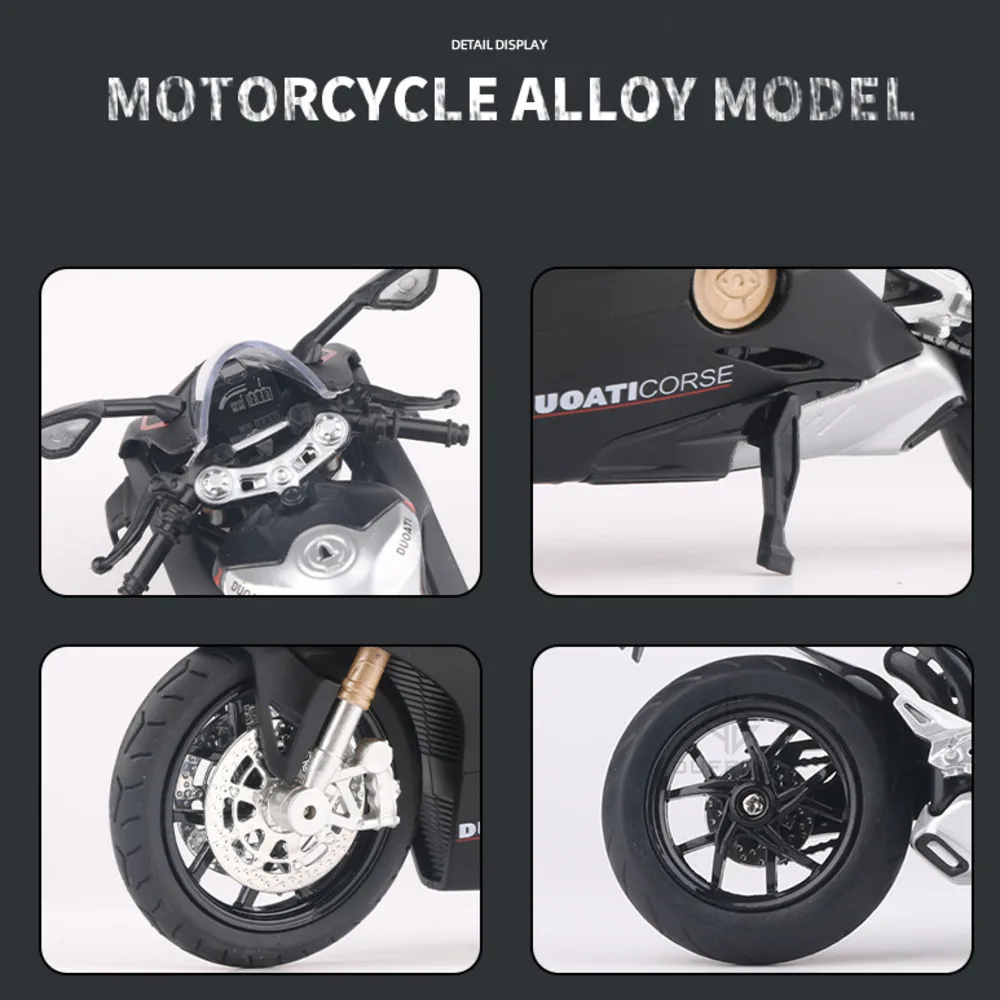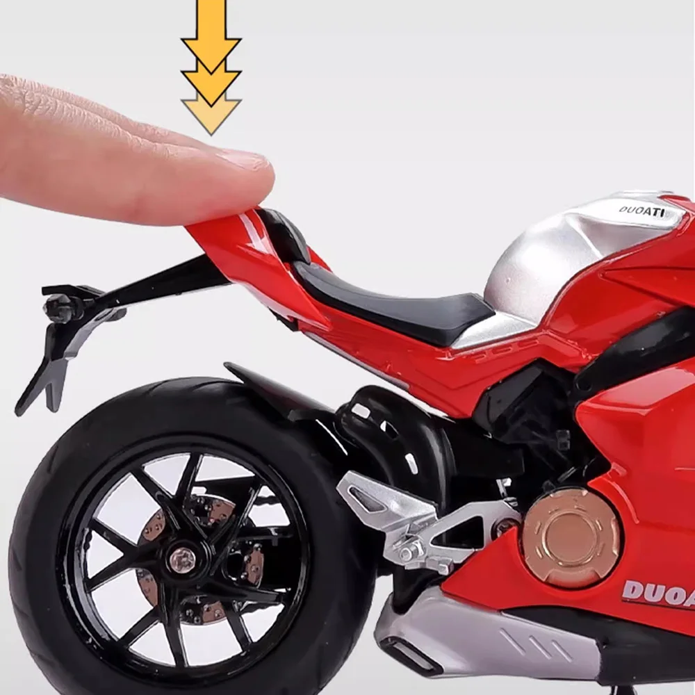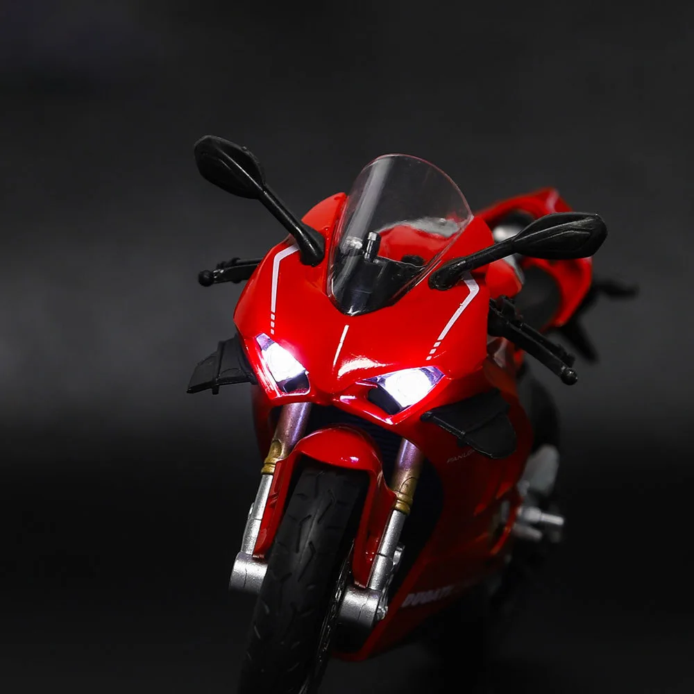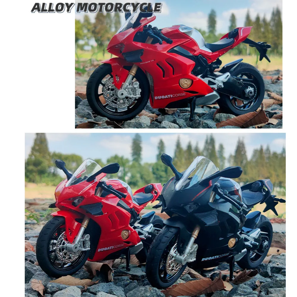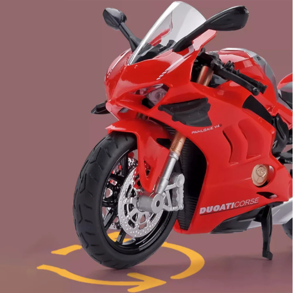 Experience the thrill of the Ducati Panigale V4S with this highly detailed 1/12 scale diecast motorcycle model, measuring approximately 17.5 x 6.5 x 9 cm. Crafted with a robust alloy body in striking red and black colors, it features realistic sound and light functions, shock absorption, and a durable plastic chassis with rubber tires. The model’s aerodynamic design showcases sharp, angular fairings, a sculpted fuel tank with the “PANIGALE V4” logo, and sleek black handlebars. Perfect for collectors aged 14 and above, this high simulation replica combines impressive craftsmanship with transportation-grade durability, offering a stunning addition to any display or collection.