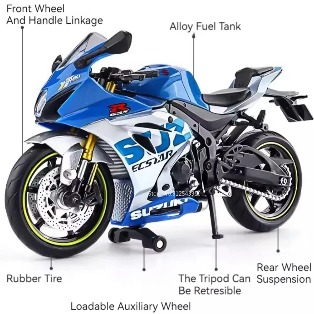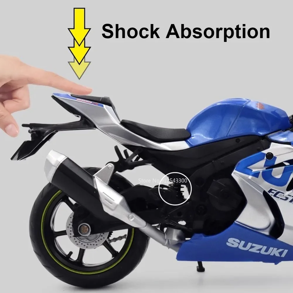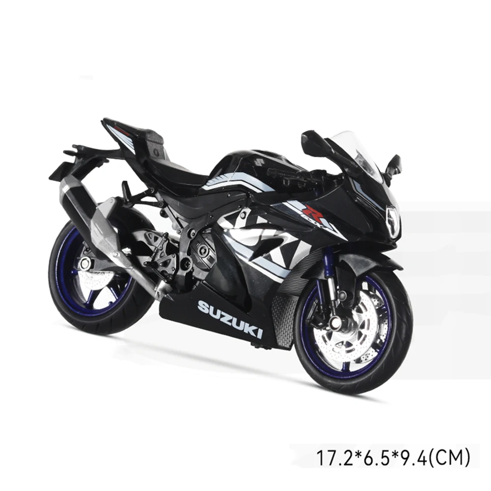Experience the thrill of a racing motorcycle with this 1/12 scale SUZUKI GSX R1000R model, featuring a sleek alloy body, durable plastic chassis, and rubber tires. Measuring approximately 17.2 x 6.5 x 9.4 cm, it offers realistic front wheel steering, rear wheel suspension, and coast functionality. Available in striking colors like blue, black, and red, this high-simulation diecast collectible is designed for enthusiasts aged 14 and above. Its detailed, aerodynamic design includes bold decals, a tinted windshield, and contrasting yellow front suspension, making it both a visually impressive display piece and a functional model for display or gift purposes.