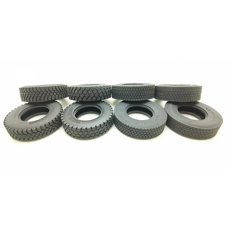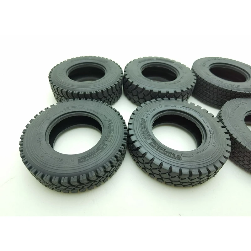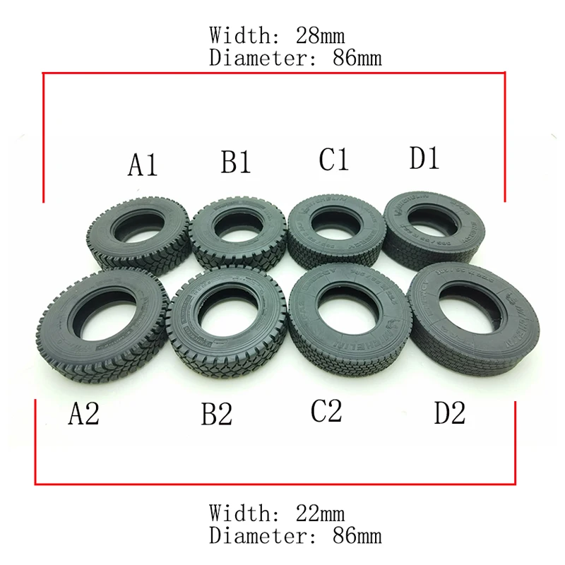 Imagine enhancing your RC truck with these highly detailed black rubber tires, designed specifically for 1/14 scale models. Crafted with precision and durability, they feature intricate tread patterns that mimic real truck tires. The aggressive deep treads provide a rugged look and improve traction, while the more uniform grid design on the other tire emphasizes functional realism. The tires have a consistent width of 28mm and a diameter close to 86mm, ensuring perfect compatibility with your Tamiya, Scania 770S, MAN, Benz Actros 3363, or trailer models. Made from high-quality rubber, they offer robustness and durability for outdoor adventures. These tires are an excellent upgrade to elevate your RC truck’s visual appeal and performance, transforming your model into a more authentic and rugged vehicle.