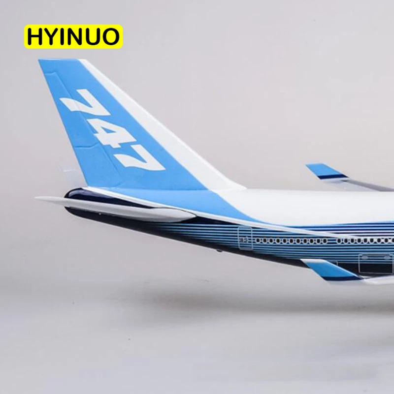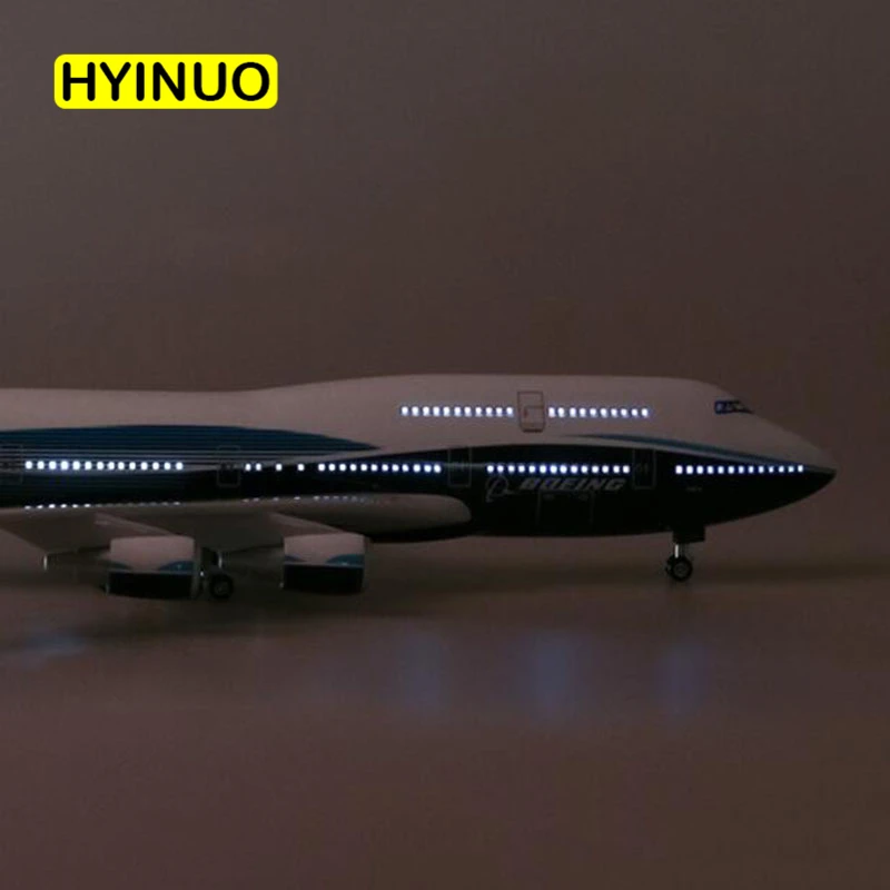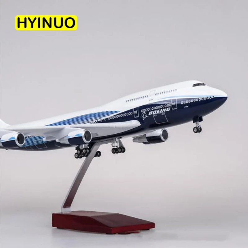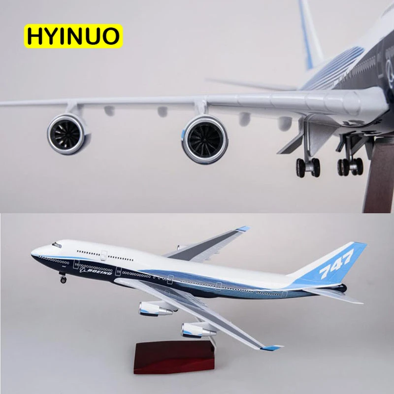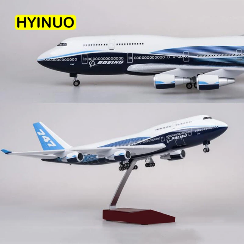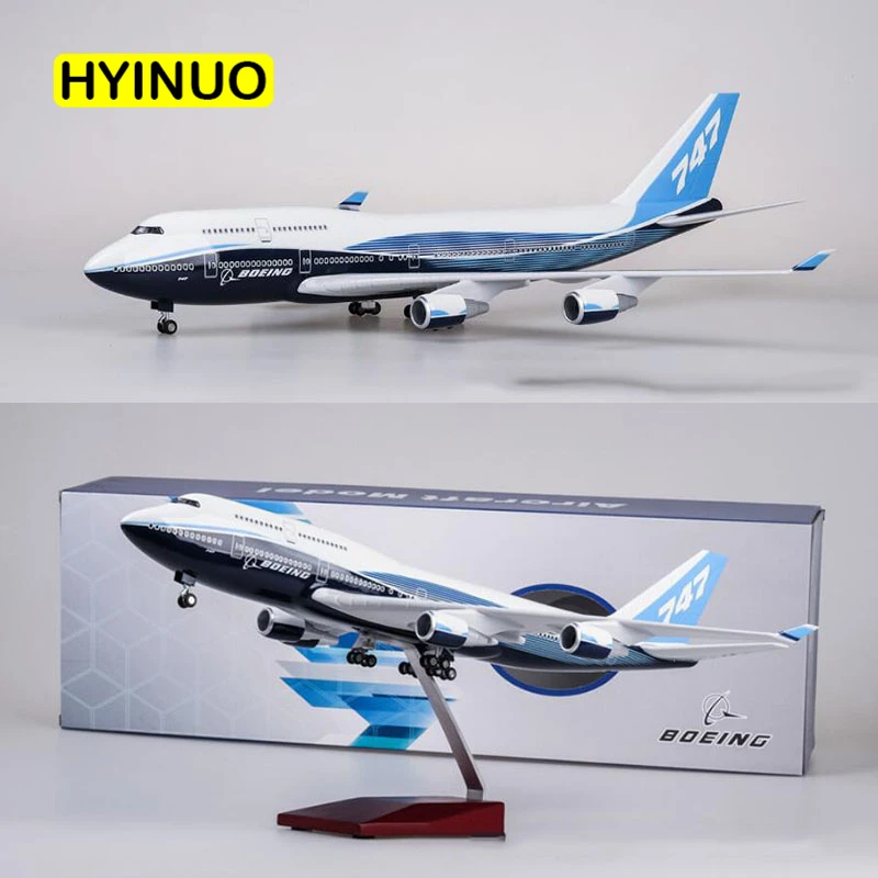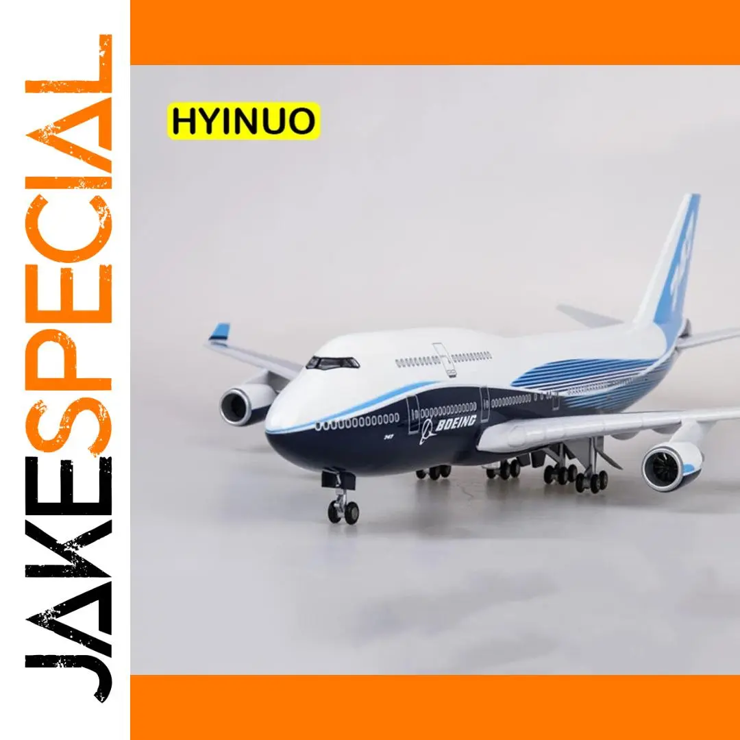 Enhance your space with this highly detailed 1/150 scale Boeing 747 model measuring 47 cm in length, crafted from diecast metal, plastic, and resin for durability and realism. The sleek white fuselage features precisely painted windows, a vertical tail fin with a blue and white design, and wings with a slight upward curve at the tips. The model includes movable wings and wheels, with black-painted tiny wheels supported by silver masts. It is equipped with a voice-controlled cabin light that emits a soft glow for approximately 20 seconds. Perfect as a sophisticated decorative piece for home, office, bar, or desk, this fragile model is recommended for collectors aged 14 and above.