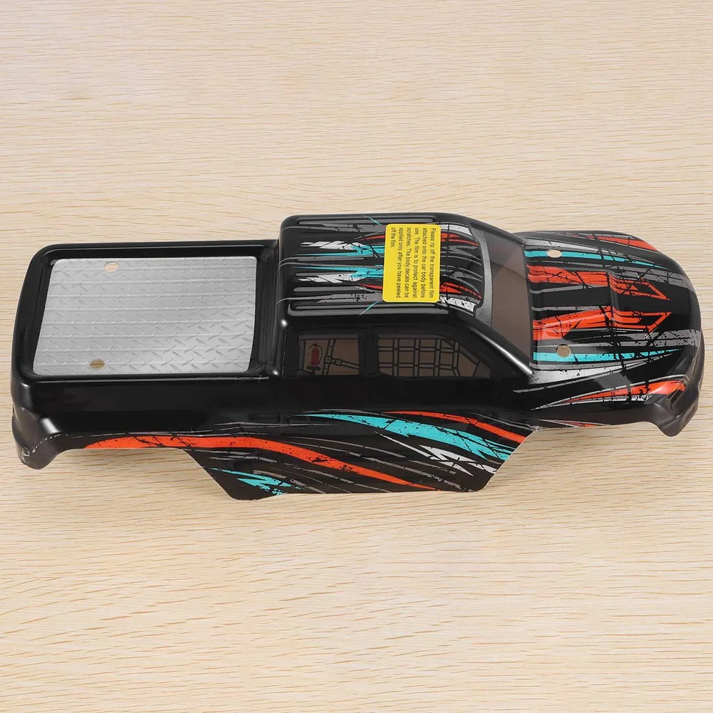 Transform your 1/16 scale RC vehicle with this high-quality body shell, designed to bring a bold and sporty aesthetic to your car. Crafted from sturdy black plastic, it offers increased durability and strength, ensuring your vehicle can handle challenging terrains while maintaining its sleek appearance. The shell features dynamic, racing-inspired decals in red, blue, and gray, with sharp lines and abstract patterns that evoke speed and energy. A clear panel on the roof mimics a sunroof or vent, outlined with a metallic silver textured pattern resembling diamond plating, adding a subtle metallic touch. Small white circular holes serve functional or aesthetic purposes, complementing the overall racing design. This shell is perfect for customizing your model and giving it an aggressive, high-performance look.