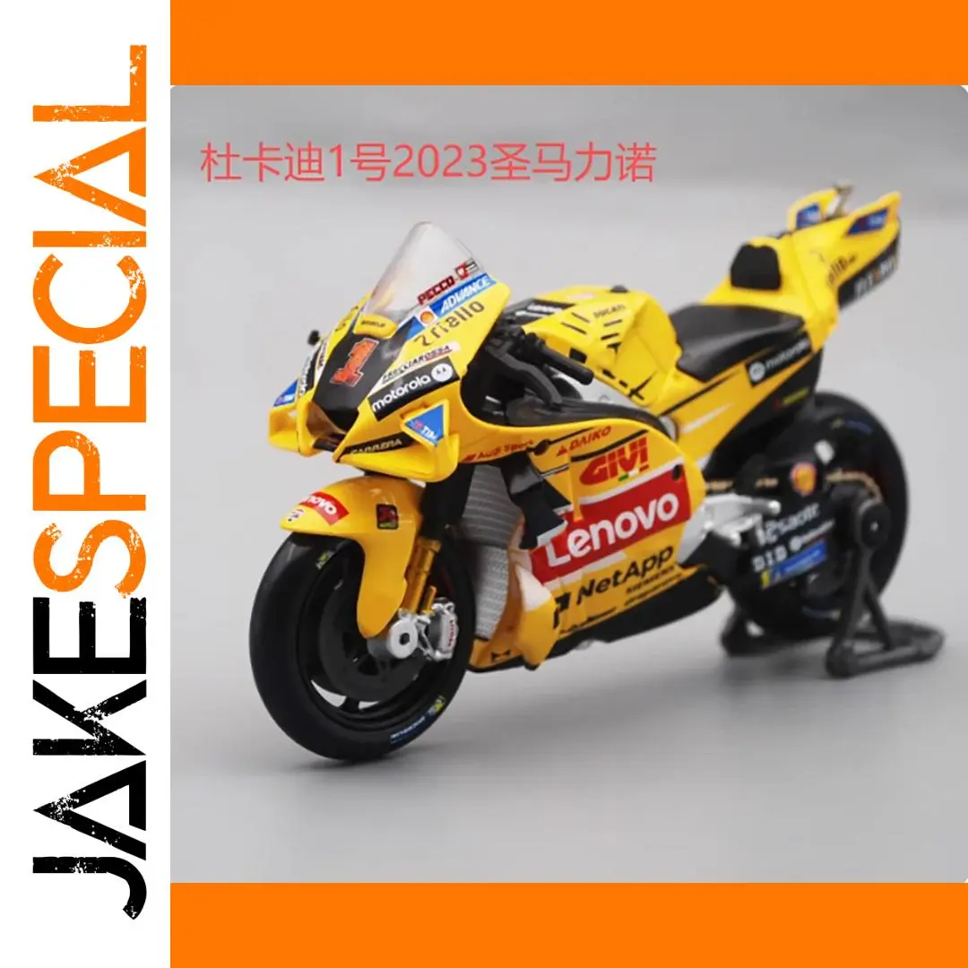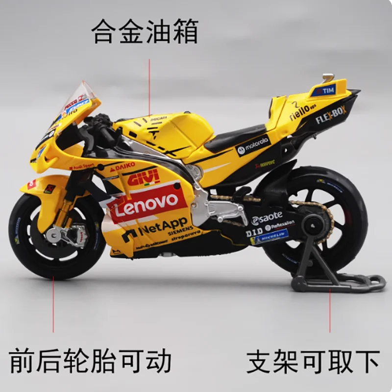 Imagine elevating your collection with this highly detailed, miniature motorcycle. Crafted from durable alloy and plastic, this 12-centimeter model captures the essence of a professional racing bike. Its sleek yellow finish, accented by sharp black details, creates an eye-catching display piece. The intricate decals and sponsor logos, including “Lenovo,” “NetApp,” “GIVI,” “DUNLOP,” and “moto radio,” add authenticity and vibrancy. The front features a small clear windshield, a smoothly integrated headlight area, and a striking gold-colored fork. The textured black seat, detailed handlebars, controls, and miniature features bring realism to life. Perfect for collectors and enthusiasts, this model exudes sporty elegance and craftsmanship.