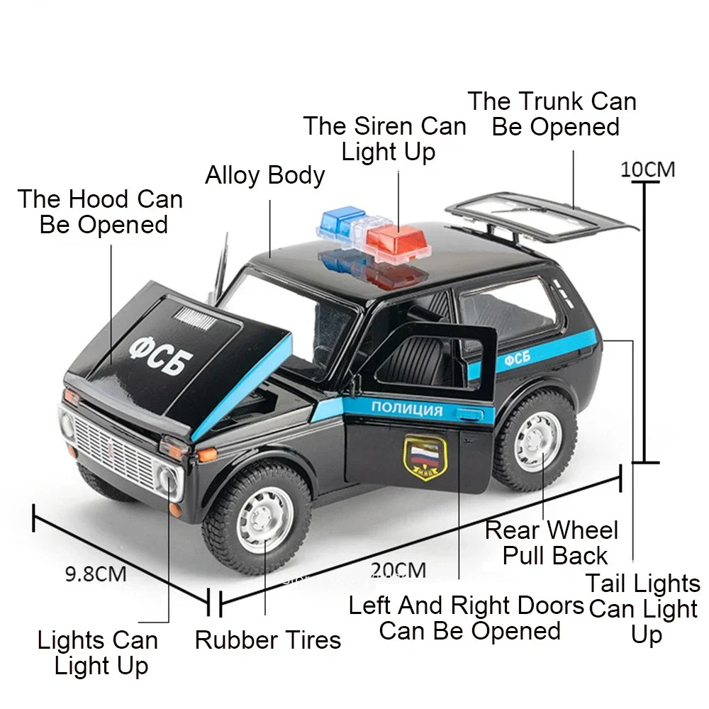 Imagine adding this impressive 1/18 alloy diecast model of the Russia Lada NiVa Police Car to your collection or display. With realistic features like opening doors, sound, and light effects, this model provides a highly detailed and engaging replica. Its durable alloy body and sturdy construction ensure it remains a treasured piece for years to come. Perfect for collectors or enthusiasts, this vehicle sparks conversation and admiration. Visualize placing this model on your desk or shelf, appreciating its craftsmanship and true-to-life design. Whether for display or as a gift, this model elevates any space with its realism and quality, making every detail worth noticing. Experience the thrill of owning a realistic police car model today.