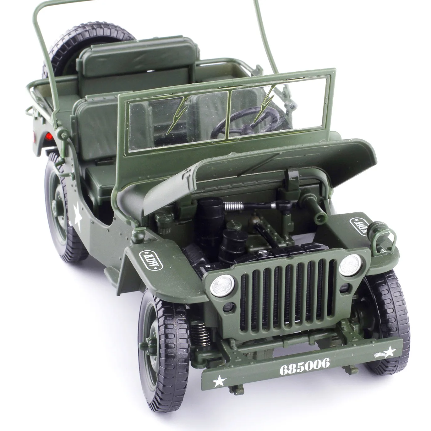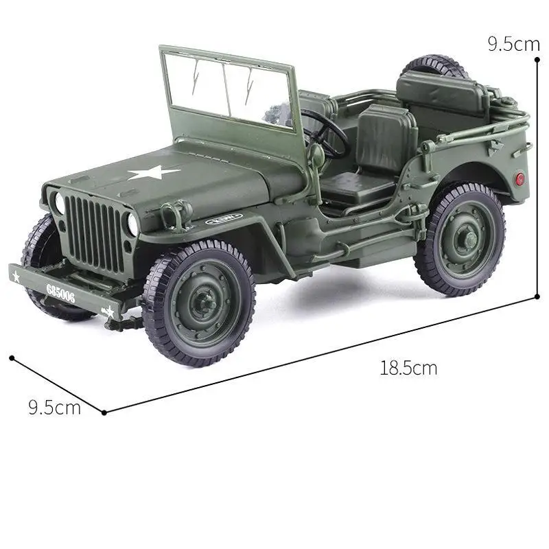 Experience the rugged charm of this highly detailed 1/18 scale miniature model of a Willys-style military jeep. Carefully crafted from zinc alloy, this diecast model sports a durable matte military green finish, perfectly capturing the utilitarian spirit of vintage military vehicles. Its realistic design features a distinctive vertically slatted front grille, round headlights on each side, and a boxy body shape that exemplifies classic off-road functionality. The open-top setup reveals a minimal interior with simple, proportionate dark green or black components, enhancing its authentic military look. With textured tires showing rugged tread pattern, mounted on matching solid green hubcaps, this model exudes off-road readiness. Small side mirrors, a spare tire at the rear, and subtle details like a white star emblem complete its striking appearance. It’s an ideal collectible, gift, or display piece for enthusiasts.
