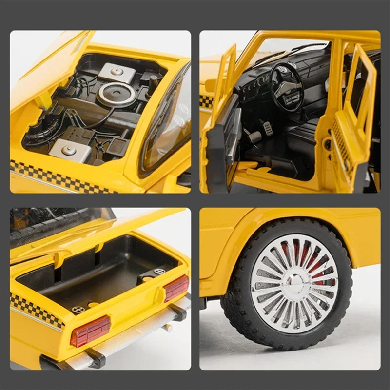 This exquisite 1/18 scale diecast model of the classic Russian LADA NIVA taxi is a stunning collectible that captures the essence of iconic taxi design. The vibrant bright yellow finish, coupled with eye-catching black checkered patterns, showcases its authentic taxi spirit. Features like a chrome-finished square grille, realistic headlights, and a sunroof exemplify meticulous attention to detail. The interior mimics a real taxi layout, making it an impressive addition to any collection. With durable materials and craft, this model delivers not just aesthetic value, but also the excitement of taxi nostalgia. It’s not just a model; it’s a piece of automotive history ready to be part of your collection.