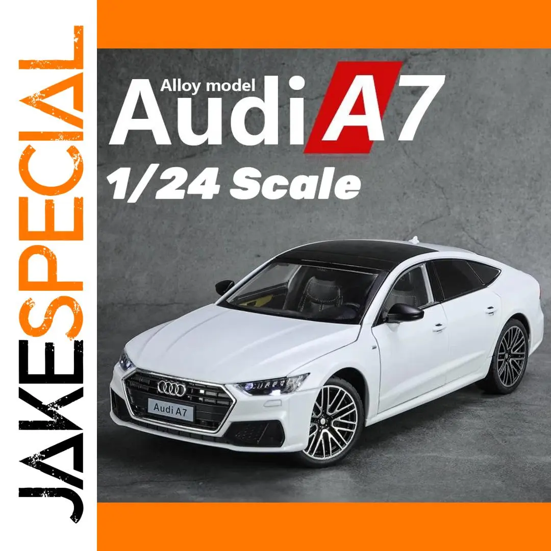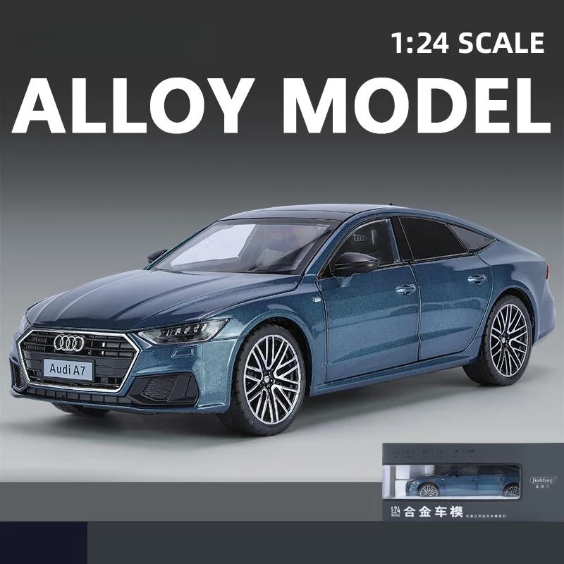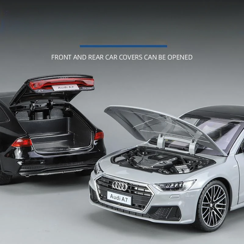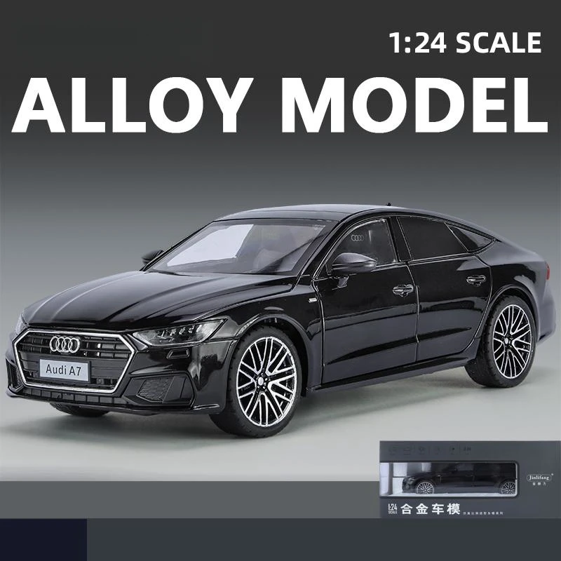 Experience the craftsmanship of this 1/24 scale diecast alloy A7 model, featuring a realistic design with a sleek white body and a glossy black roof. Detailed elements include a bold front grille with the four-ring logo, precisely molded LED-style headlights, multispoke silver alloy wheels with textured rubber tires, and streamlined black side mirrors. Openable doors reveal an interior that enhances its lifelike appeal. Equipped with pull-back, sound, and light functions, this collectible vehicle is ideal for enthusiasts aged 14 and above and is available in four stunning colors: white, black, silver, and blue. Perfect for display or gifting.