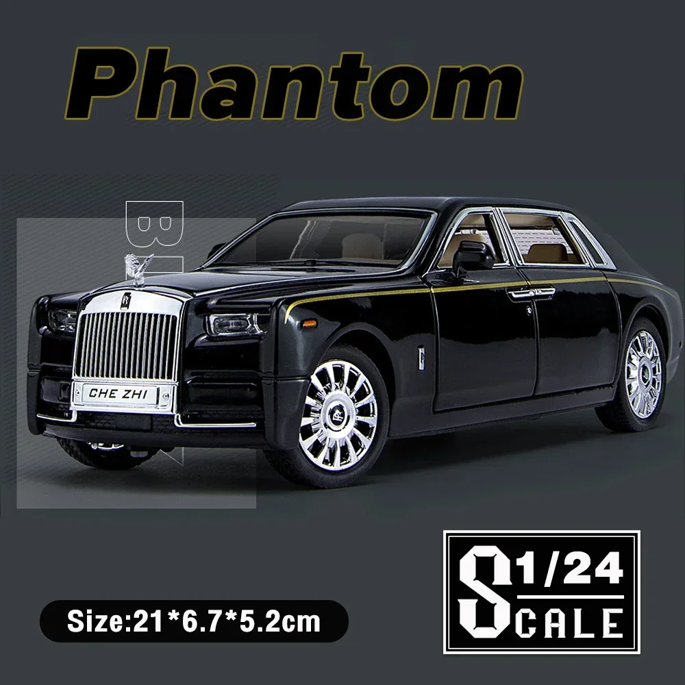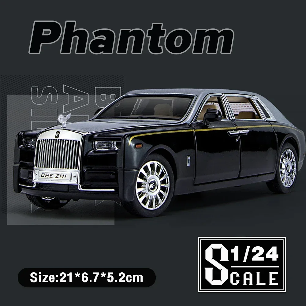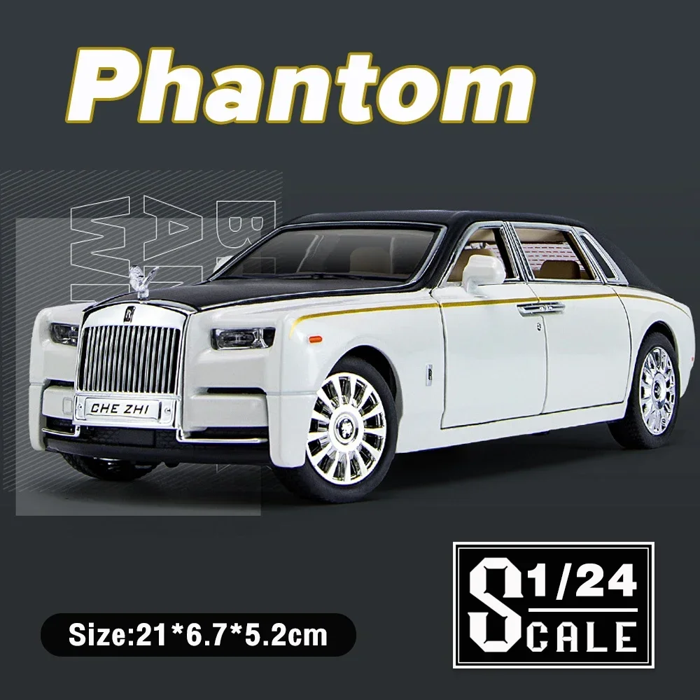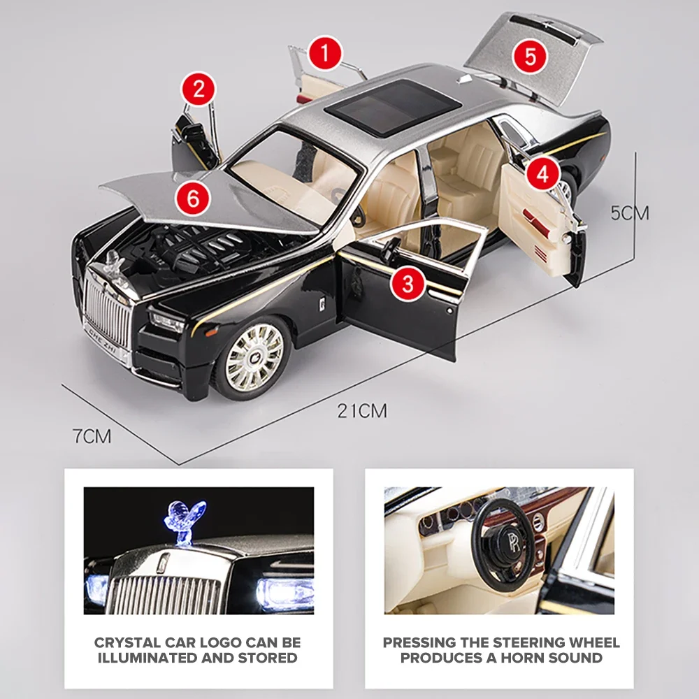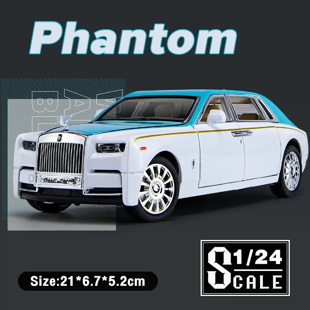 Experience the refined elegance of this scale 1/24 diecast Rolls Royce Phantom, crafted from a sleek metal body, smooth plastic chassis, and durable rubber tires. Its meticulously detailed design captures the luxury and sophistication of the original, with a glossy finish available in colors such as classic white, metallic black, shimmering silver, and a striking blue-white combo. Realistic features include illuminated headlights and front grille, an iconic Spirit of Ecstasy hood ornament, and opening doors and hoods, allowing you to showcase every fine detail. With pullback motion and sound/light effects, this model offers both aesthetic appeal and interactive fun. Perfect for collectors, display, or as a special gift for enthusiasts aged 14 and above.