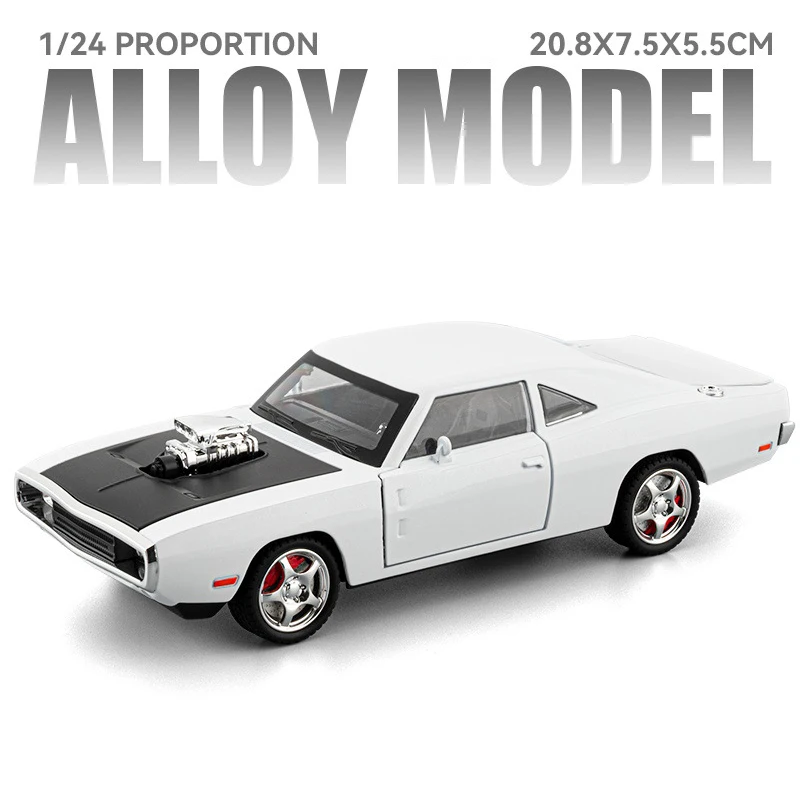 Experience the thrill of high-performance with this 1/24 scale diecast model of a Dodge Charger, crafted from alloy and plastic with a sleek, glossy black finish. It features realistic design details such as a muscular body shape, a prominent front grille with horizontal slats, round headlights, and a chrome-finished engine hood with a supercharger and circular intake openings. The model boasts multi-spoke alloy wheels with low-profile tires, capturing the sporty essence of a muscle car. Enhanced with simulation sound and light functions, this collector’s piece is perfect for enthusiasts seeking a detailed, dynamic display or a high-quality gift.