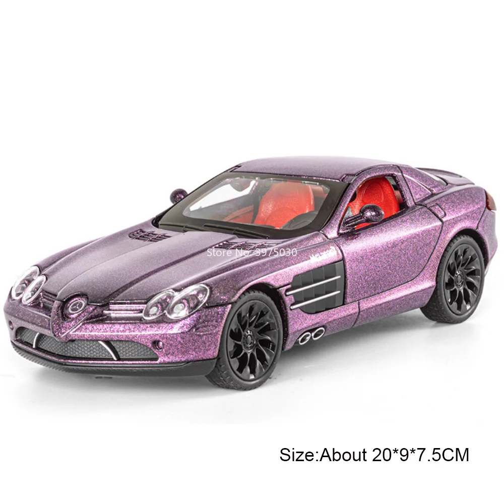 Imagine adding a touch of elegance and realism to your collection with this meticulously crafted miniature Mercedes-Benz SLR. Rendered in a sleek, metallic finish, the model boasts a zinc alloy body that shines vividly under light, mimicking the luxurious exterior of a real sports car. Its aerodynamic contours are accented by finely detailed elements such as side vents, a prominent grille, and realistic headlights, emphasizing performance and style. The vibrant red interior visible through the open doors creates a bold contrast with the exterior, enhancing its visual appeal. Measuring approximately 20 cm long, 9 cm wide, and 7.5 cm high, this model captures every detail with precision, making it a perfect decorative piece or collectible for car enthusiasts.