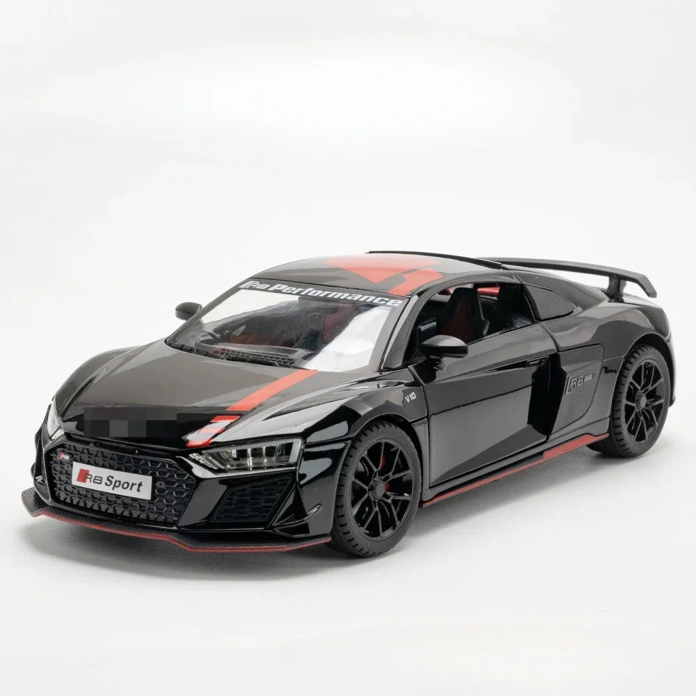 Imagine owning a stunning, ultra-realistic miniature of the iconic R8 V10 supercar. Crafted with precision, this 1/24 scale model captures every detail, from its sleek, aerodynamic silhouette to the finely sculpted hood and striking racing stripe. The black exterior accented with bold red highlights emphasizes its aggressive and luxurious look. With functional doors that open effortlessly, revealing a detailed interior finished in vivid red upholstery and dashboard components, you can truly appreciate the craftsmanship. The model’s wheels feature a multi-spoke design with rubber tires, offering a lifelike driving appeal. Designed for display or interactive use, it makes a perfect gift for passionate car enthusiasts who want a high-quality piece that stands out on any shelf or desk.