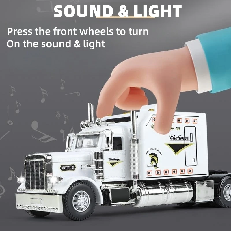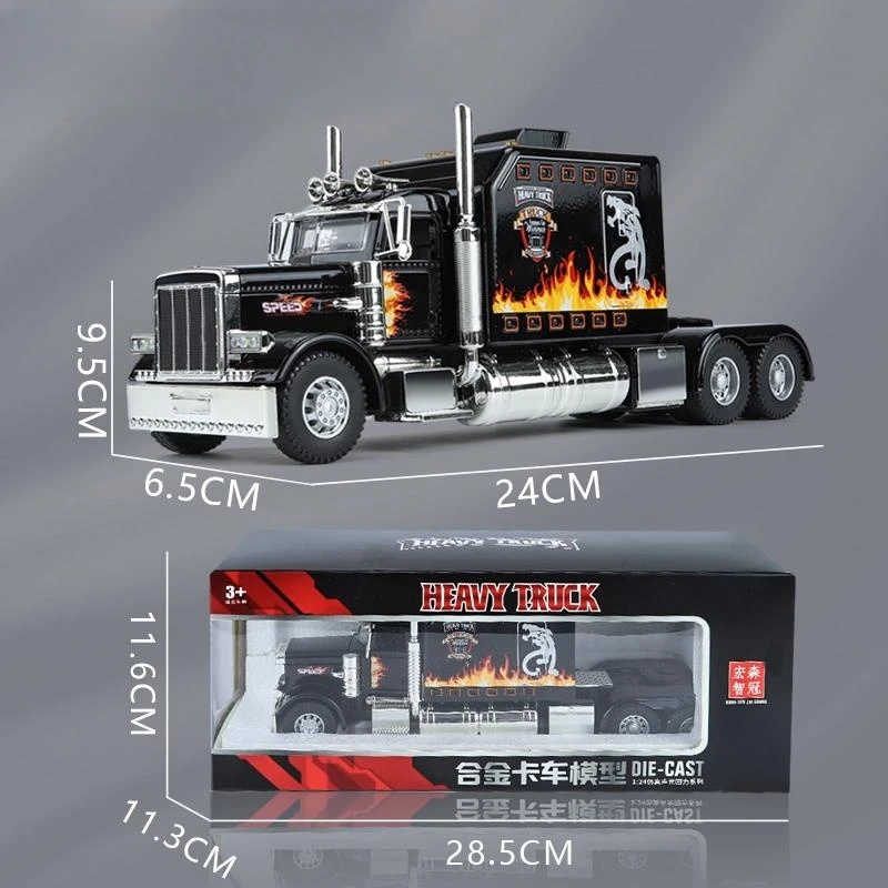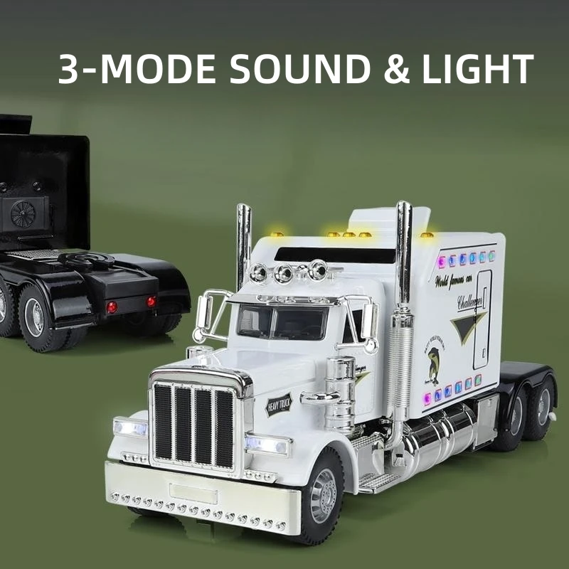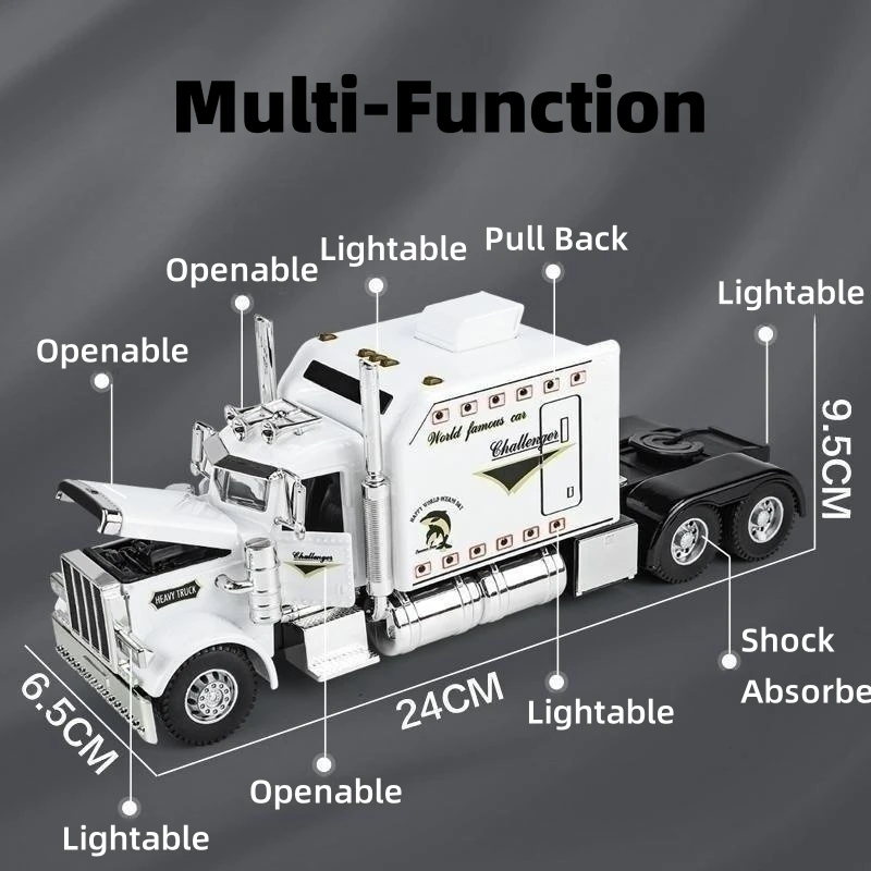This highly detailed 1/24 scale diecast alloy tow truck model offers an interactive display piece with functional pull-back mechanism, sound, and lighting effects. Available in white, red, and black, it features realistic metallic finishes, detailed grille, exhaust stacks, and vibrant decals, capturing the bold aesthetic of American tow trucks. Constructed from durable metal, this collectible is designed for enthusiasts aged 14 and older and is ideal for display or collection, bringing a touch of industrial realism to any collection. Its size and features make it a striking addition that showcases expert craftsmanship and dynamic design.