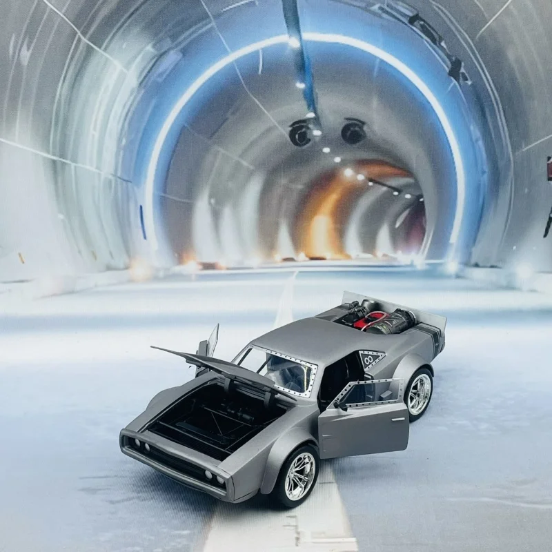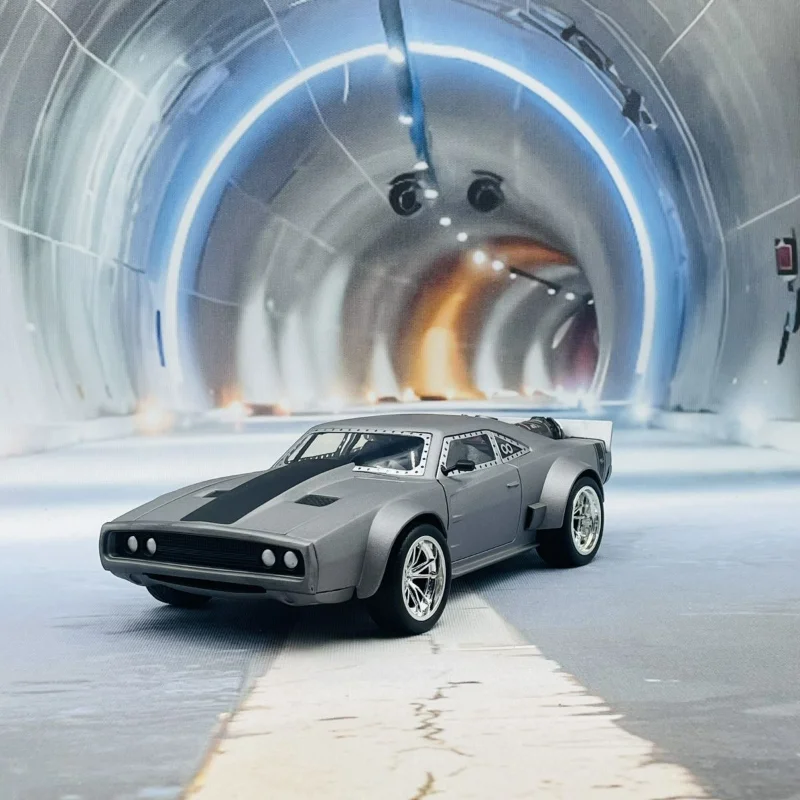 - Finished in a sleek metallic silver paint with a distinct black racing stripe along the hood, emphasizing sporty elegance and attention to aesthetic details.