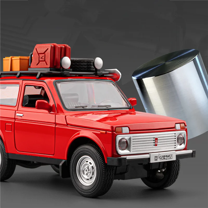 Experience the thrill of owning a miniature yet authentic replica of the iconic LADA NIVA SUV with this meticulously crafted 1/24 scale alloy model. Designed for both collectors and enthusiasts, it features a vibrant red glossy finish that highlights its rugged, off-road styling. The detailed angular lines, black accents on the grille, bumper, wheels, and roof rack, along with transparent windows, bring every element of the real vehicle to life. Equipped with simulation sound and lighting functions, this model offers an engaging display or playful interaction. Its sturdy die-cast alloy construction ensures durability, while the included accessories add a realistic adventure-ready appearance. Whether on display or in action, this model embodies robust off-road aesthetics and superior craftsmanship.