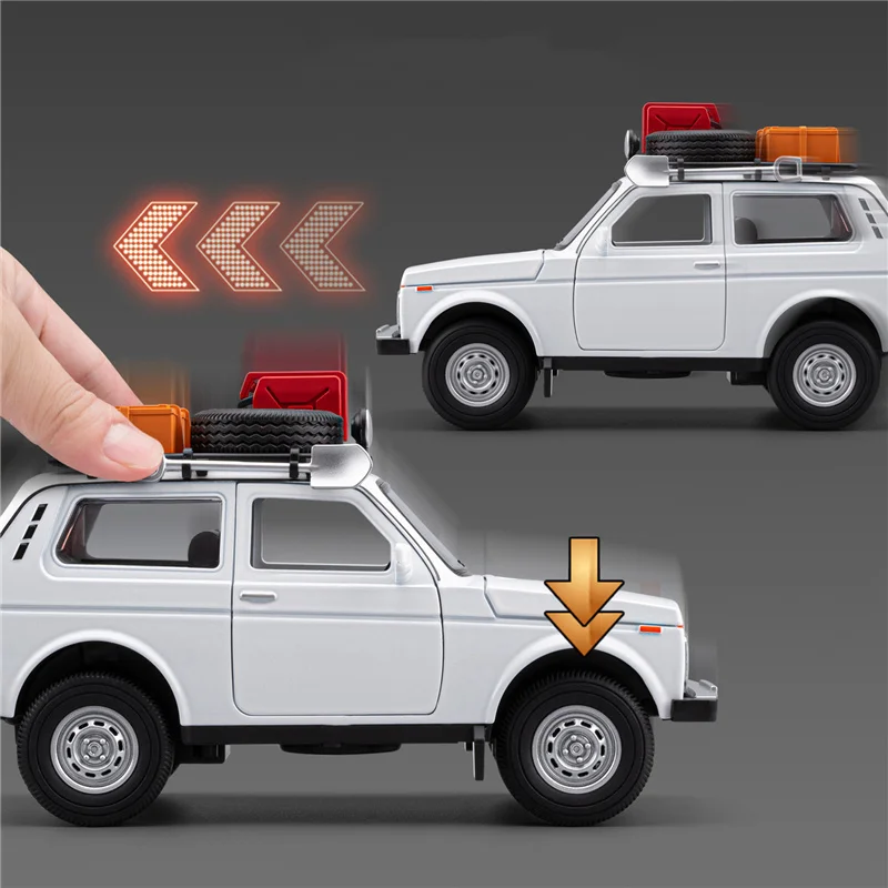Transform your collection with this highly detailed and visually stunning miniature of the LADA NIVA SUV. Perfect for display or imaginative play, it captures the essence of durability and off-road action. Its compact size makes it easy to showcase on shelves, desks, or in display cases. Built with quality materials and featuring realistic sound and light effects, this model is sure to impress. Whether you’re a dedicated collector or a passionate off-road admirer, this model will elevate your display and become a focal point of admiration. Don't miss the opportunity to own such an authentic and rugged replica.