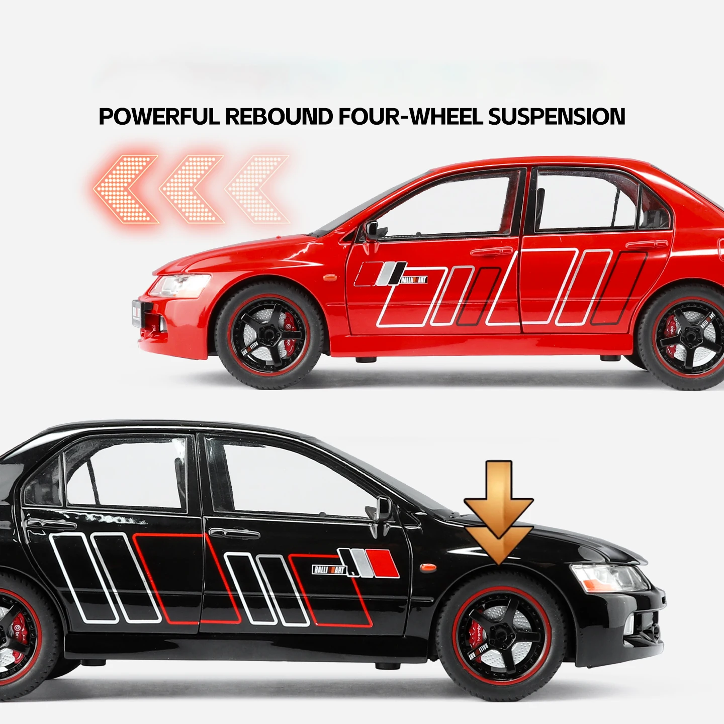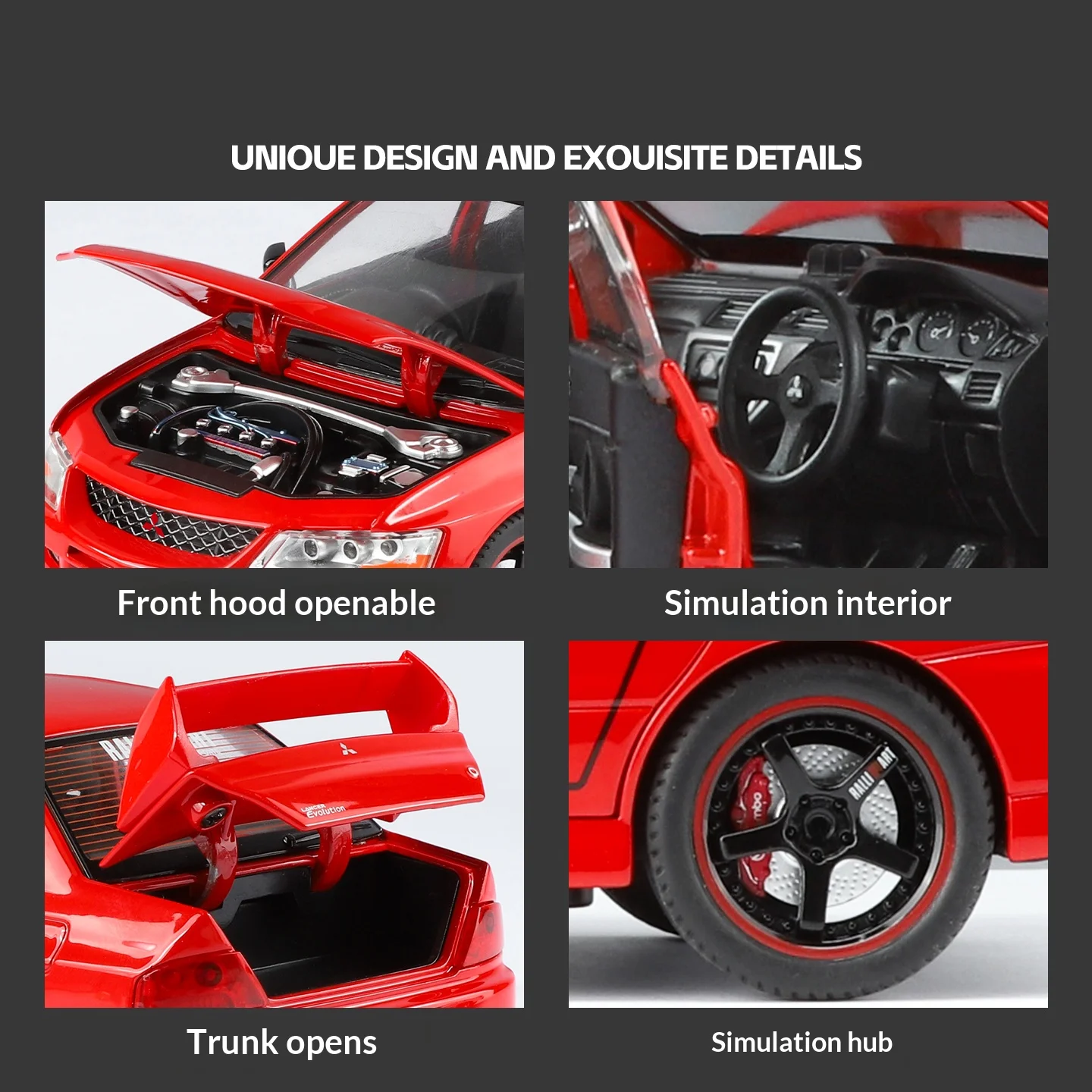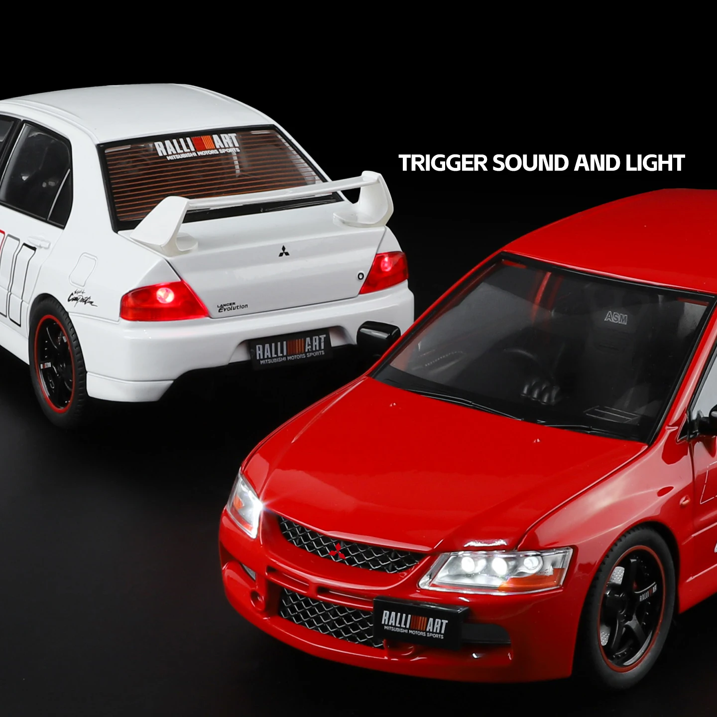 Imagine adding a striking, highly detailed miniature of the legendary Mitsubishi EVO9 to your collection. This 1/24 scale diecast model captures the sleek and aggressive design of the original, with a glossy red finish that truly stands out. Its aerodynamic body features a sloped hood, authentic racing decals, and a prominent rear wing spoiler that emphasizes its racing pedigree. The model boasts realistic details such as clear headlights, textured black grille, openable doors, and a trunk revealing a detailed interior. Equipped with sound and light functions, it offers a mesmerizing display that brings this sports car to life. Perfect as an exquisite desktop ornament or a thoughtful gift for car enthusiasts, this model seamlessly blends craftsmanship with aesthetic appeal.