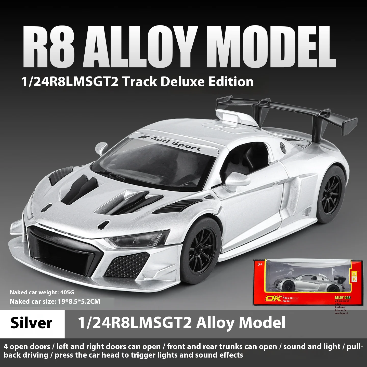 Imagine the admiration you'll receive when showcasing the stunning 1/24 scale R8 LMS GT2 Track Edition automobile model. Constructed from high-quality metal die-cast materials, this stunning model boasts a sleek silver finish that captures the essence of high-performance sports cars. With intricate details like aggressive air intakes, realistic headlights, and a pronounced rear spoiler, you'll find yourself marveling at the craftsmanship. The interactive sound and light features create an engaging experience, transporting you right into the heart of the racing world. Whether it's a centerpiece in your collection or a cherished gift, this model is sure to be a conversation starter.