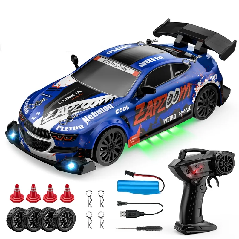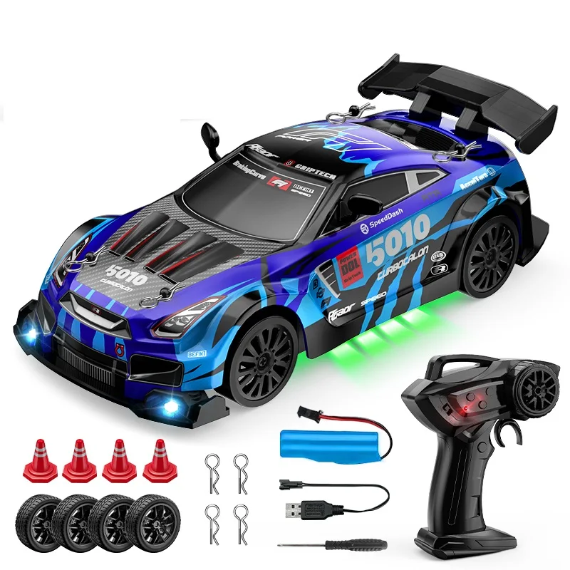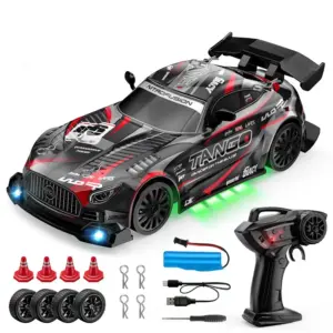 Experience the thrill of high-speed racing with this 1/24 scale remote control four-wheel drive drift sports car. Made from durable plastic, this ready-to-go toy offers an immersive driving experience for enthusiasts aged 14 and up. Featuring a 4-channel remote control with an optimal control distance—precise details provided—this model boasts LED headlights, green ambient lighting, and a sleek aerodynamic design accented by vivid racing decals in colors like black, blue, gray, and orange. The car provides approximately 25 minutes of flight time per charge with a 3.7V power supply. Its detailed steering servo, stylish rims, and drifting tires make it perfect for competitive races or casual fun.