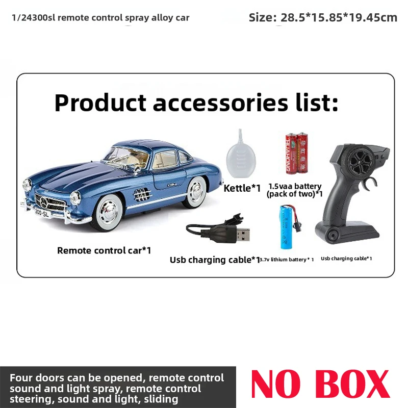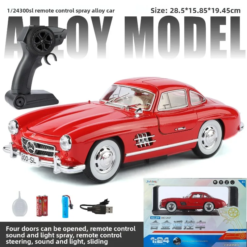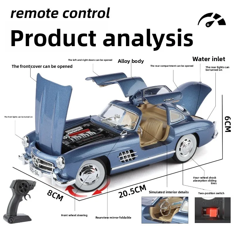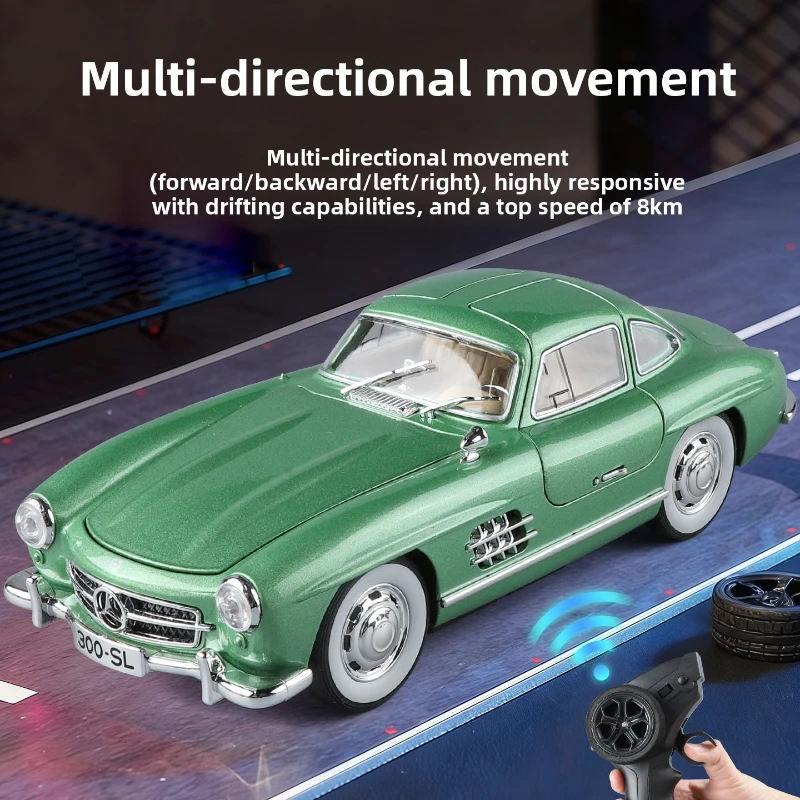 - This 1/24 scale RC car features a sleek blue gloss finish with chrome accents, capturing the vintage luxury aesthetic of the classic Mercedes-Benz 300SL vividly and attractively.