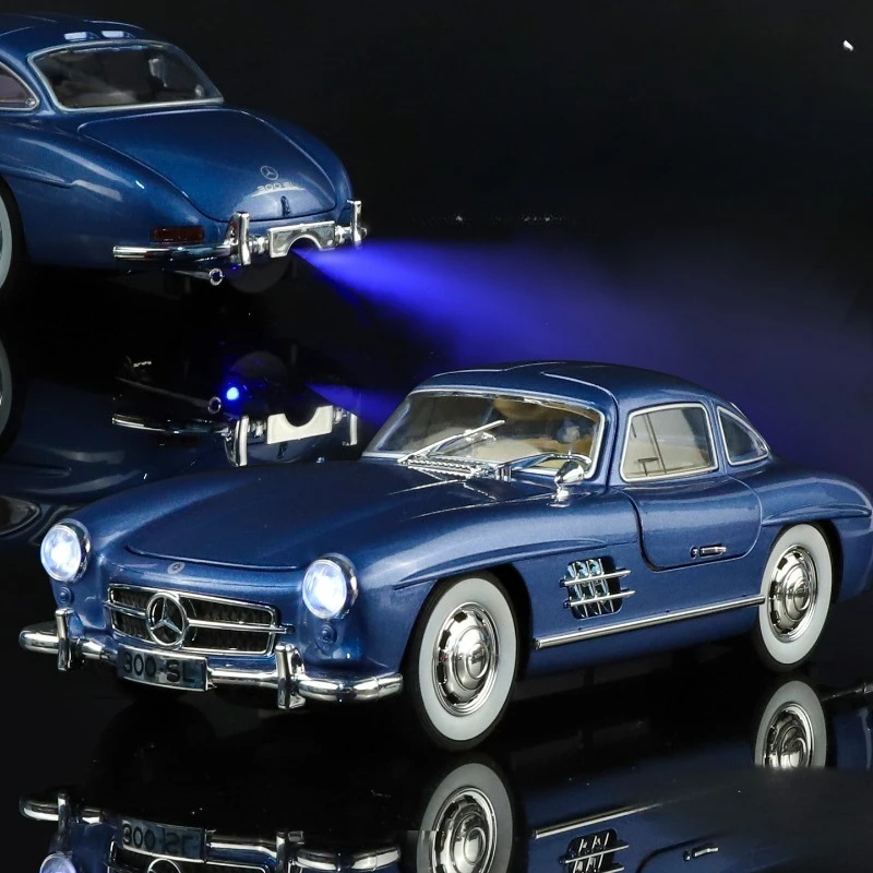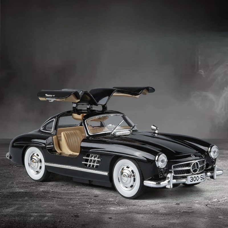 - Design details include detailed vents, stylized doors with an open gullwing, whitewall tires with intricate hubcaps, and a prominent “300-SL” license plate, enhancing its vintage charm.