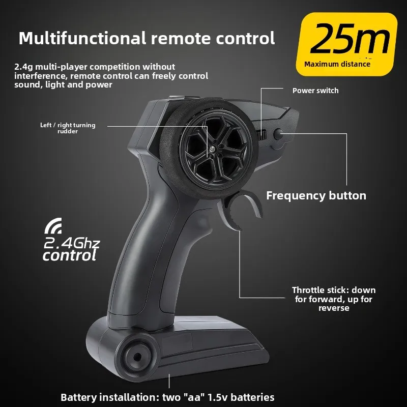 - The remote control operates via 2.4G wireless technology with 4 channels, providing precise and responsive handling for both indoor and outdoor adventures.