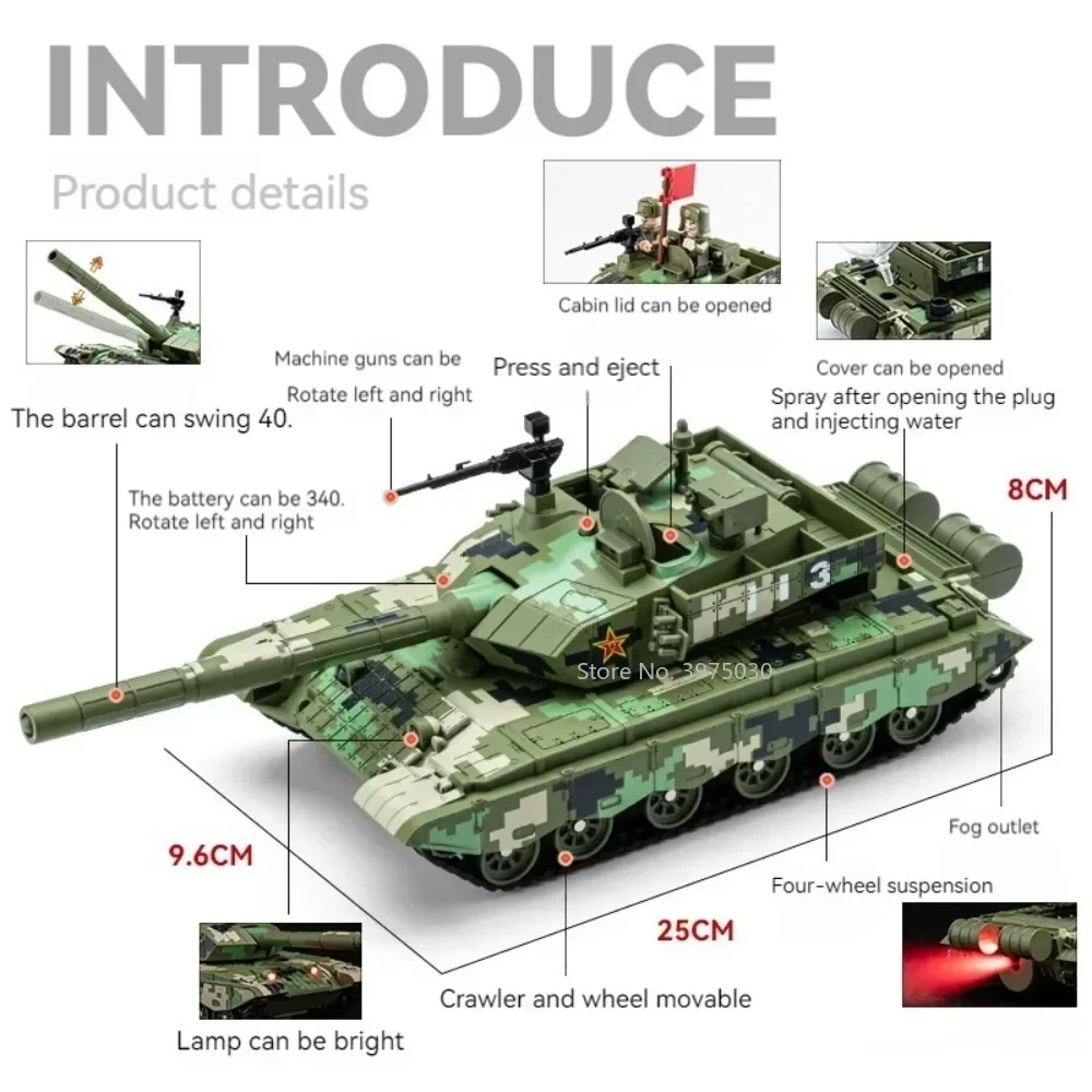 Picture yourself proudly displaying this highly detailed tank model or engaging in imaginative military scenes with ease. Its realistic design, robust construction, and functional features make it a perfect collectible or gift for enthusiasts. Bring home this impressive model and enjoy the authenticity and craftsmanship evident in every detail. With its durable alloy body and interactive functions, this tank is designed to impress and withstand prolonged use. Don't miss the opportunity to add this exceptional piece to your collection today—experience the realism and quality firsthand.