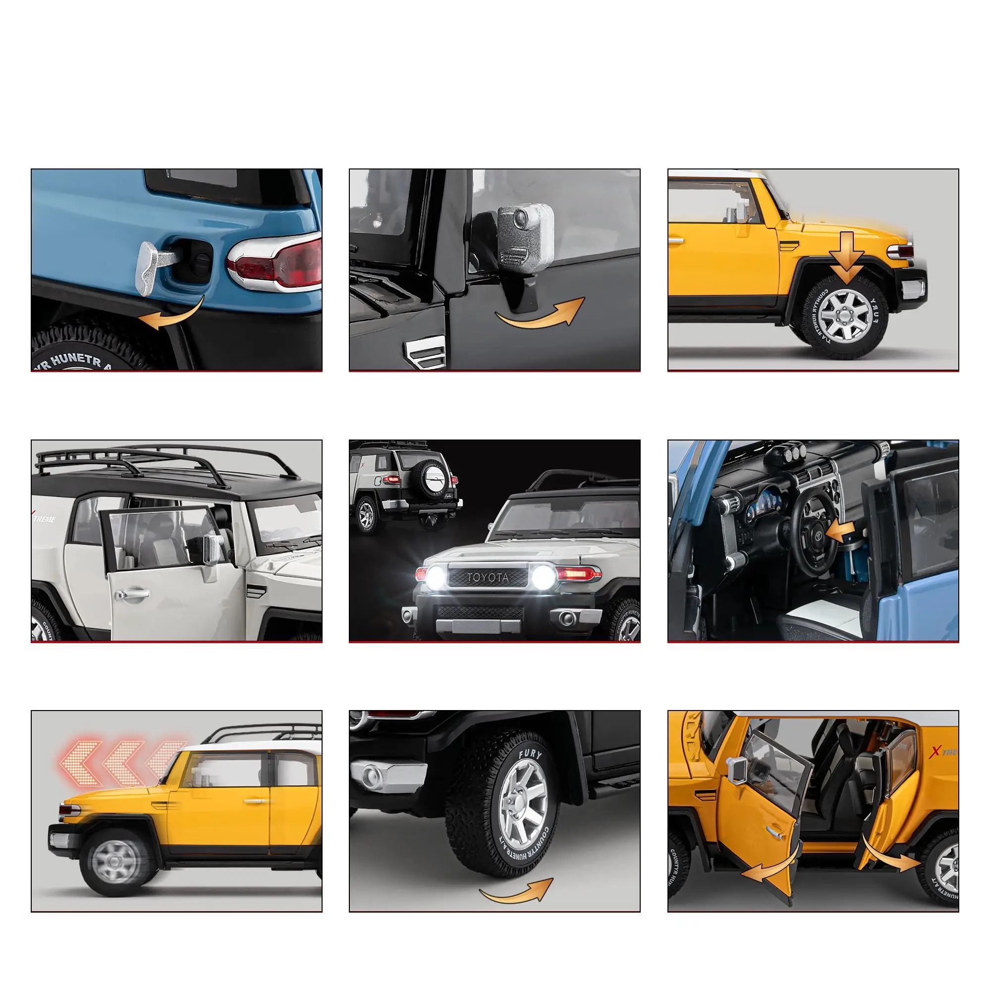 Experience the rugged charm of the full-sized Toyota FJ Land Cruiser with this highly detailed 1/24 scale diecast miniature. Crafted from durable metal alloy, each model boasts a glossy finish in vibrant colors—white, sky blue, black, and bright yellow—highlighting the sleek body lines. The black accents on the roof racks, trims, and wheel arches add contrast and realism, mimicking the true off-road look. The meticulously molded front grille, headlights, bumpers, and clear windows enhance its authenticity. Powered by a lithium battery for electronic features, this miniature offers a realistic visual appeal combined with robustness. Perfect as a collectible or display piece, it embodies adventure and durability, making it ideal for enthusiasts and collectors alike.