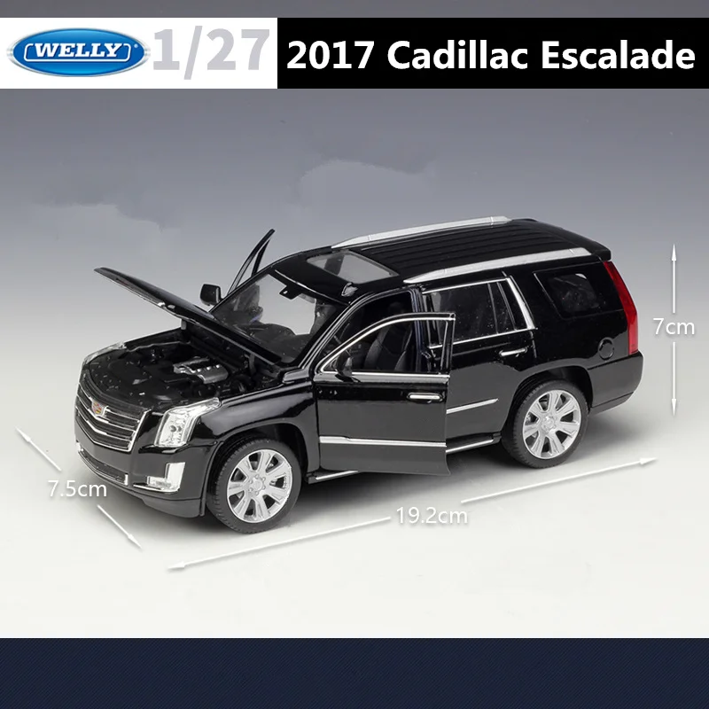 Experience the elegance of the Cadillac Escalade SUV with this 1/27 scale diecast model from Welly. Featuring a sleek, glossy black exterior constructed from high-quality alloy and plastic, this model captures the SUV’s iconic design with a prominent chrome grille, intricately detailed headlights, and defined lines that showcase its prestigious profile. The wheels are crafted from metal alloy with a sophisticated multi-spoke design, while the realistic tires and smooth roof with sunroof add to its authenticity. This non-electric model, free of battery requirements, makes a stunning display piece for collectors and enthusiasts alike. Enjoy the luxury of this detailed replica!