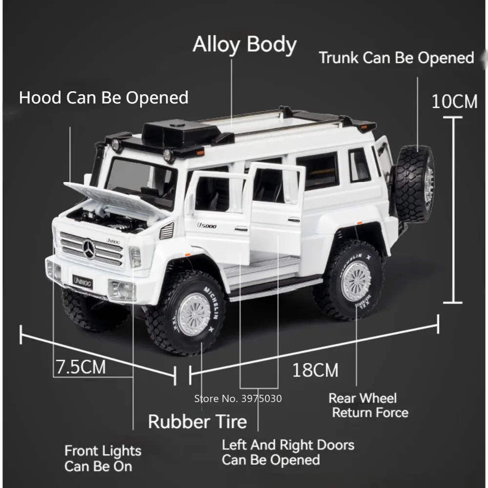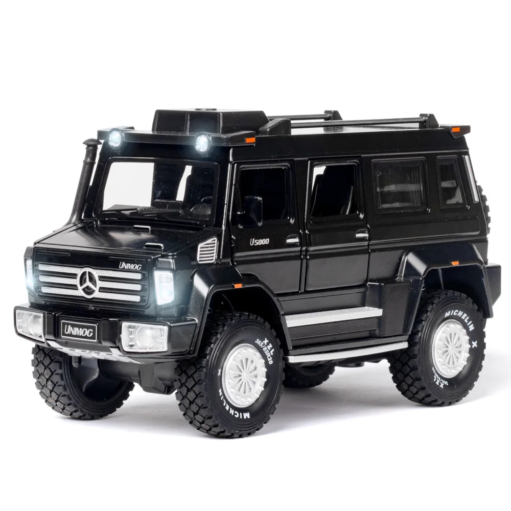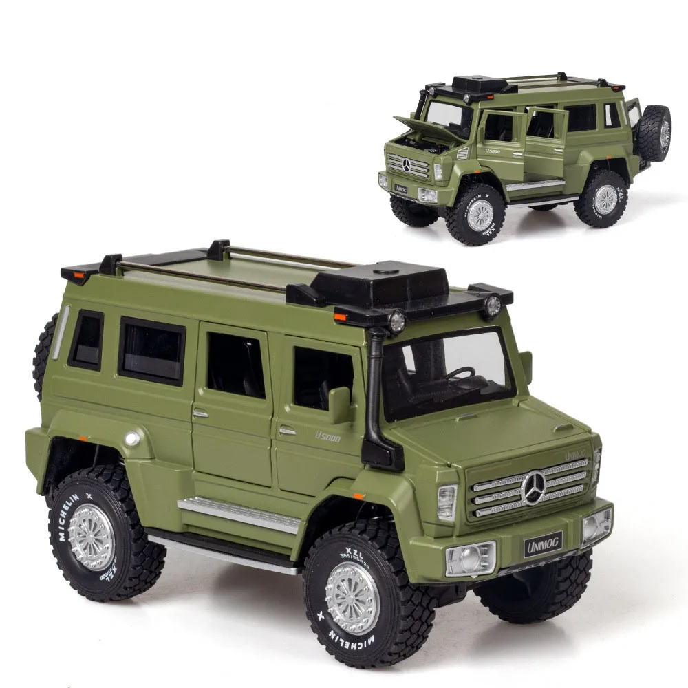 Experience the rugged realism of the 1:28 scale Mercedes-Benz Unimog U5000 miniature model, measuring approximately 18 x 7.5 x 10 cm. Crafted from zinc metal alloy with a plastic chassis and rubber tires featuring visible treads, this durable vehicle boasts impressive features including sound and light functions, a pull-back mechanism, and operable doors. Available in four striking colors—white, yellow, black, and green—it offers high simulation accuracy and craftsmanship, making it perfect for adult collectors. The model includes batteries and delivers an immersive display or play experience, bringing the off-road capabilities of the iconic Unimog U5000 to life with detailed, industrial-style aesthetics.