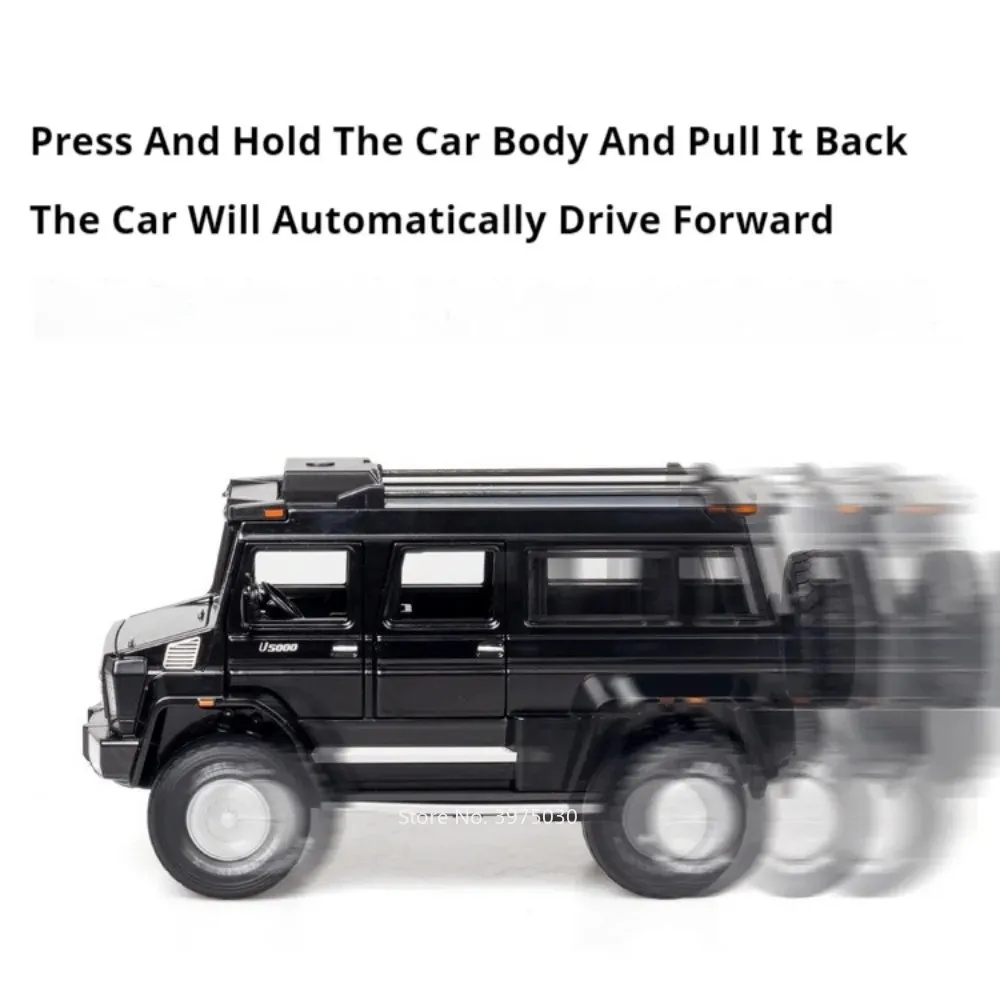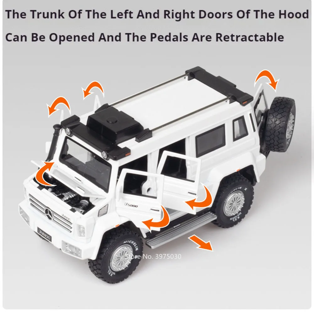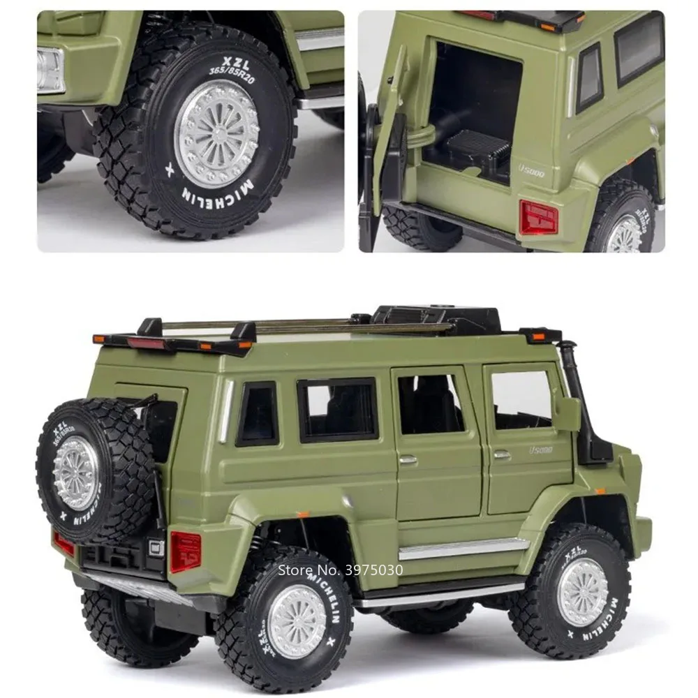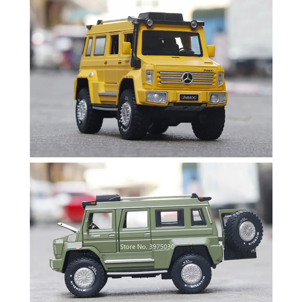 Experience the rugged realism of the 1:28 scale Mercedes-Benz Unimog U5000 miniature model, measuring approximately 18 x 7.5 x 10 cm. Crafted from zinc metal alloy with a plastic chassis and rubber tires featuring visible treads, this durable vehicle boasts impressive features including sound and light functions, a pull-back mechanism, and operable doors. Available in four striking colors—white, yellow, black, and green—it offers high simulation accuracy and craftsmanship, making it perfect for adult collectors. The model includes batteries and delivers an immersive display or play experience, bringing the off-road capabilities of the iconic Unimog U5000 to life with detailed, industrial-style aesthetics.
