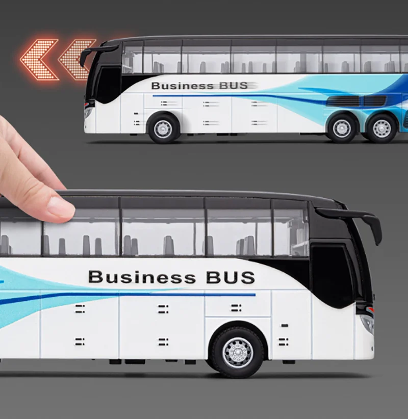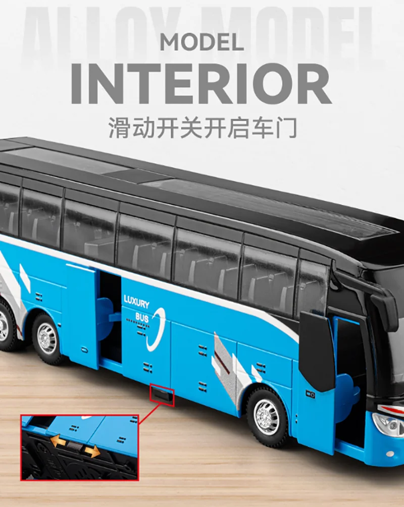 This detailed diecast model bus, scaled at 1/30 and measuring approximately 25.7 cm in length, 5.8 cm in width, and 7.5 cm in height, is crafted from alloy and plastic materials. Designed for display and collection, it features a sleek, modern design with a vibrant blue body, black accents, dark-tinted windows, and subtle white and grey angular graphic patterns. The model has six detailed silver wheels and a streamlined shape with smooth, rounded edges, embodying realism and sophistication. Suitable for enthusiasts and collectors aged 14 and above, it serves as a stylish decorative ornament, perfect for showcasing your passion for detailed miniature vehicles.