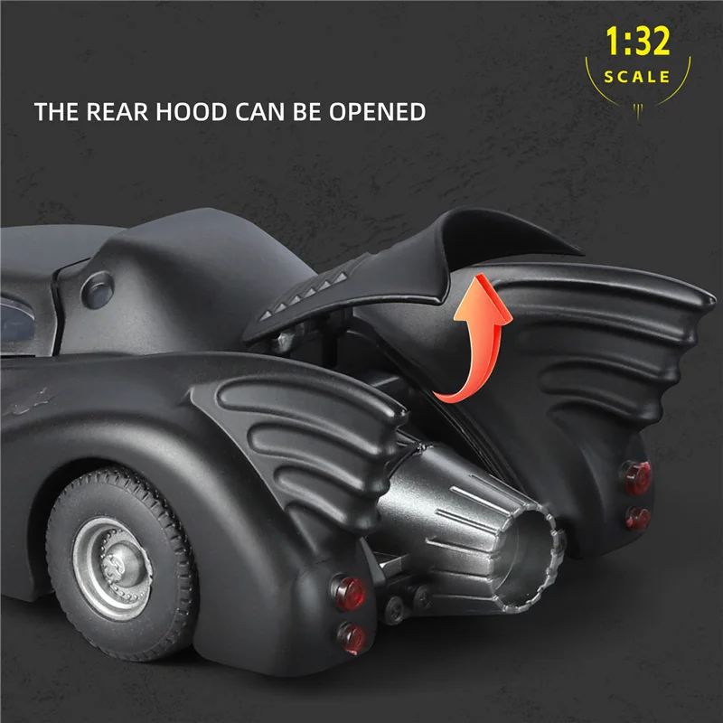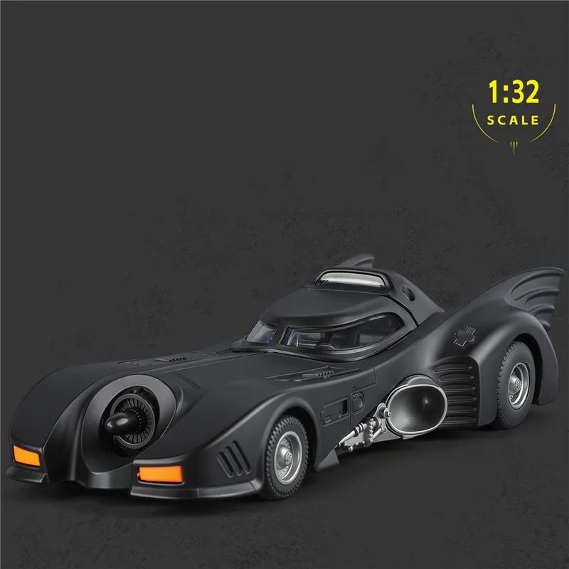 - Scale model at 1:32, offering a detailed miniature replica of the iconic Batmobile, with precise curves, angular accents, and a compact, aerodynamic profile that captures its legendary design.