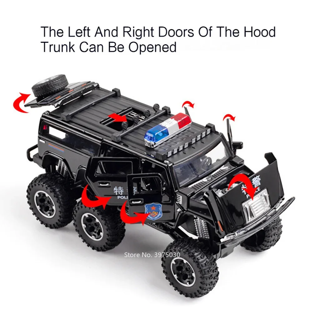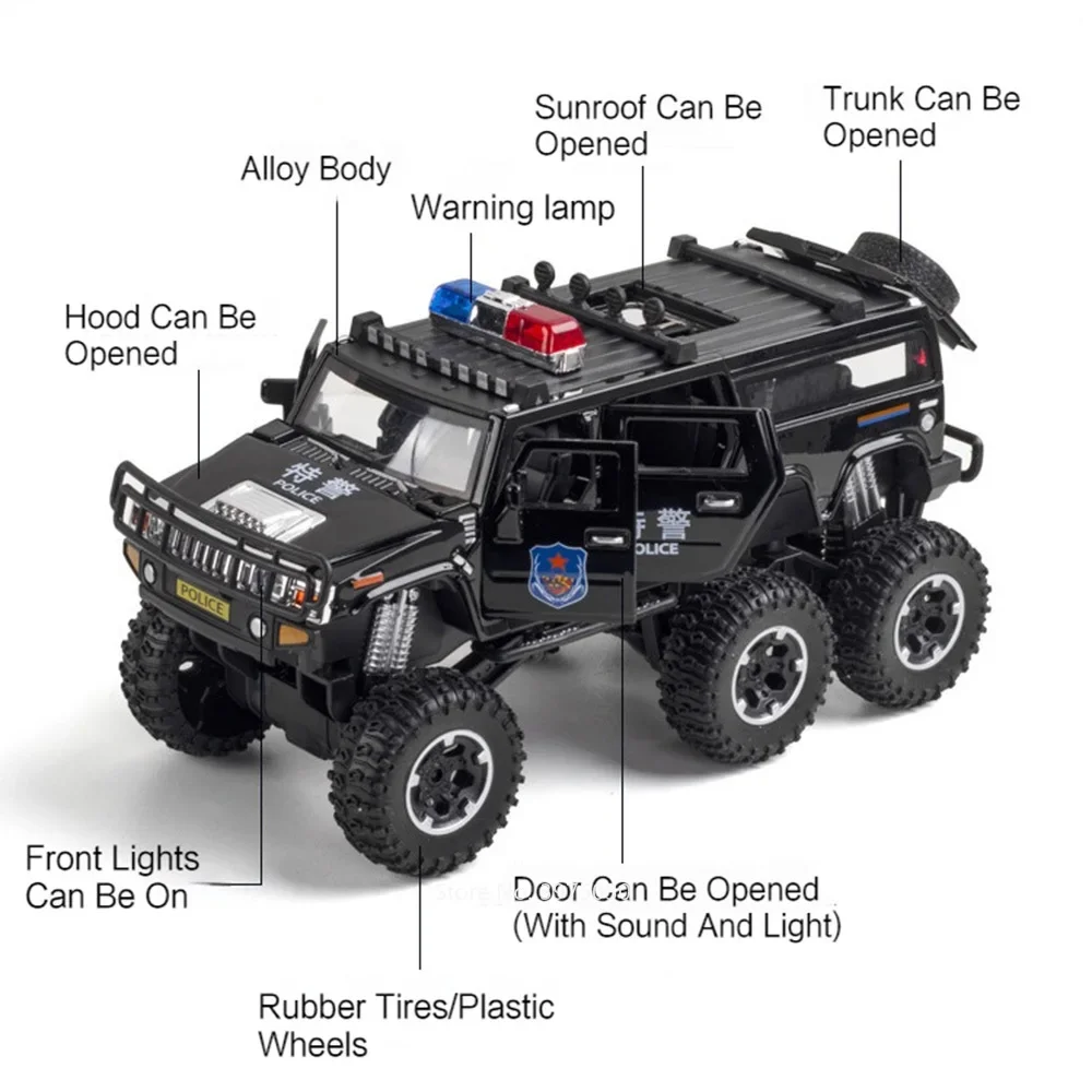 Experience the thrill of owning this realistic and rugged 1/32 scale off-road police vehicle. Crafted with a sturdy zinc metal body, plastic chassis, and rubber tires, this model captures every detail of a high-performance police truck. Its sleek black or white finish, combined with silver accents on the tires and metallic textures, highlights its tough, off-road-ready appearance. Functional doors, including six that open, add to the realism, while the bright red and blue police siren lights bring authenticity. With sound and light effects, a pull-back mechanism, and solid durability, this model is perfect for collectors and enthusiasts aged 14+. It is an excellent addition to any display or as a gift for serious vehicle lovers seeking a highly detailed replica.