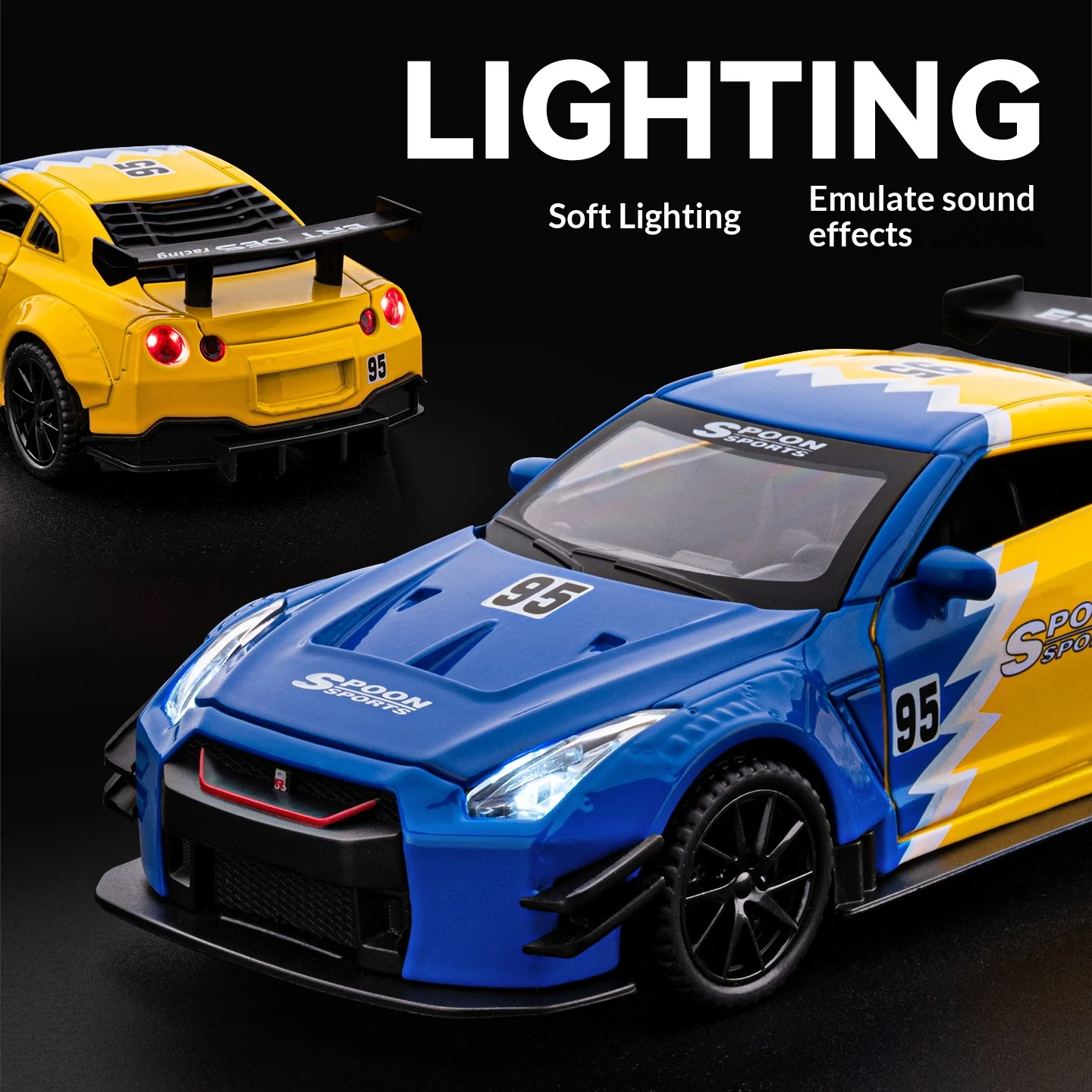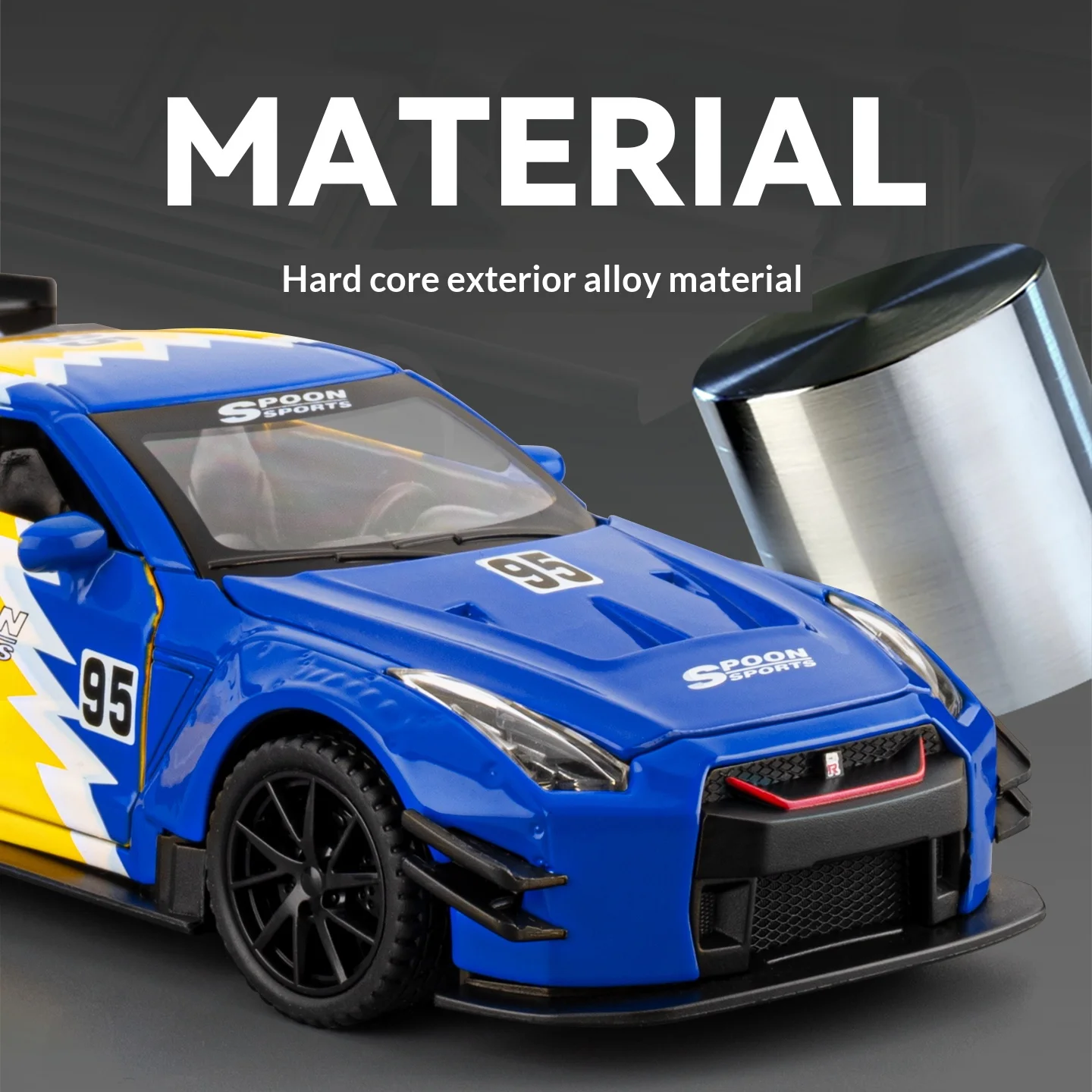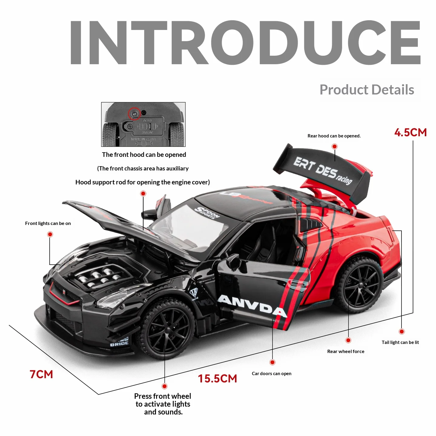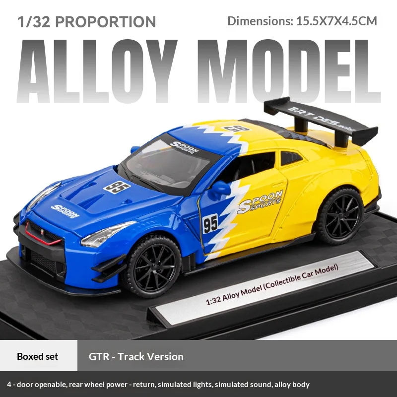Experience the thrill of high-performance racing with this 1/32 scale alloy die-casting GTR track edition car model, crafted from durable metal and featuring a striking black body with red accents or a sleek blue variant. Its aerodynamic design includes a vented hood, detailed multi-spoke black wheels with textured tires, and a prominent rear wing, capturing the essence of a racing champion. Mounted on a sophisticated display base, this collectible toy boasts CE certification and is suitable for enthusiasts aged 14 and above. With realism and durability in mind, it’s the perfect addition for any dedicated collector seeking to showcase their love for racing legends.