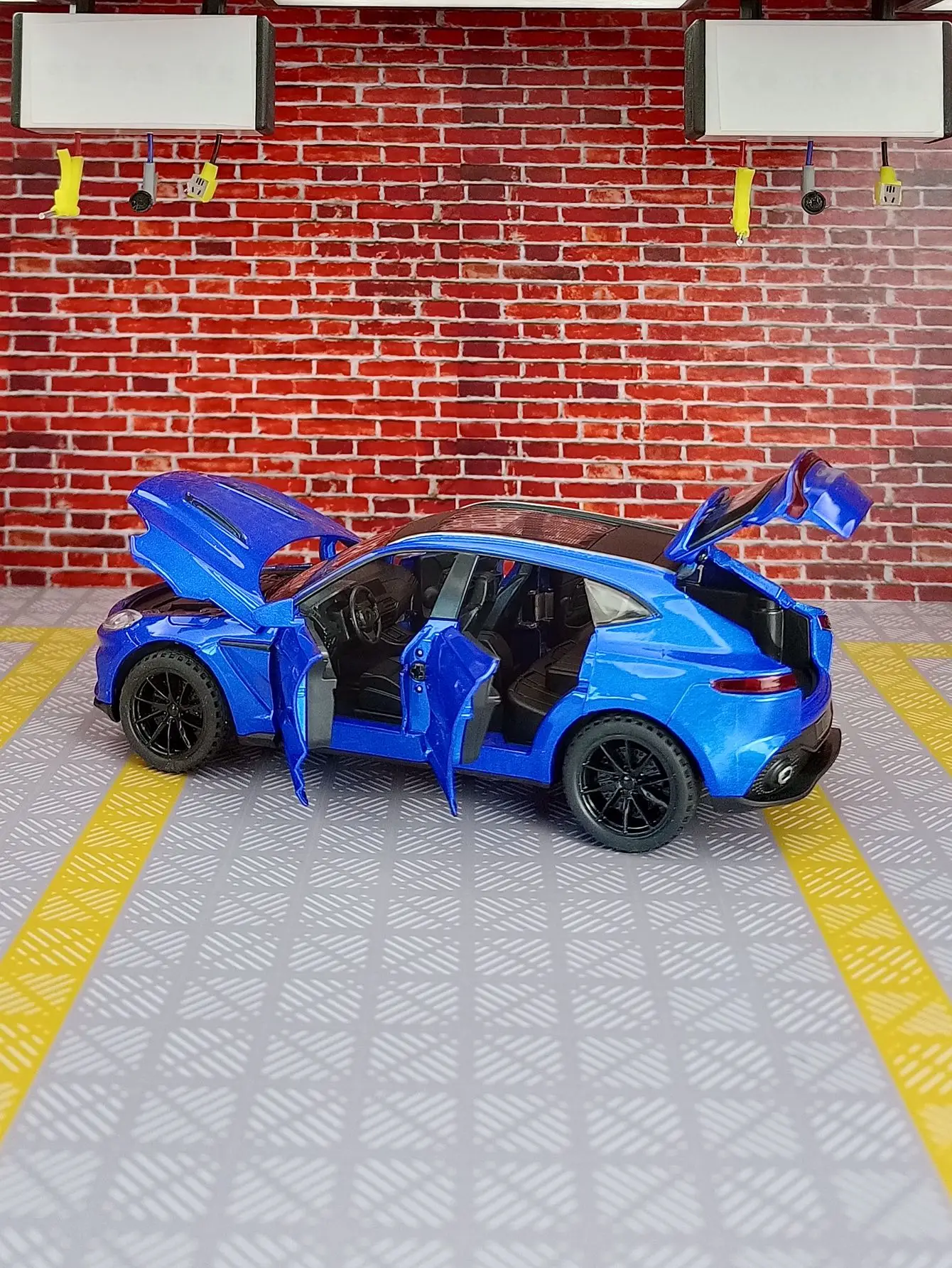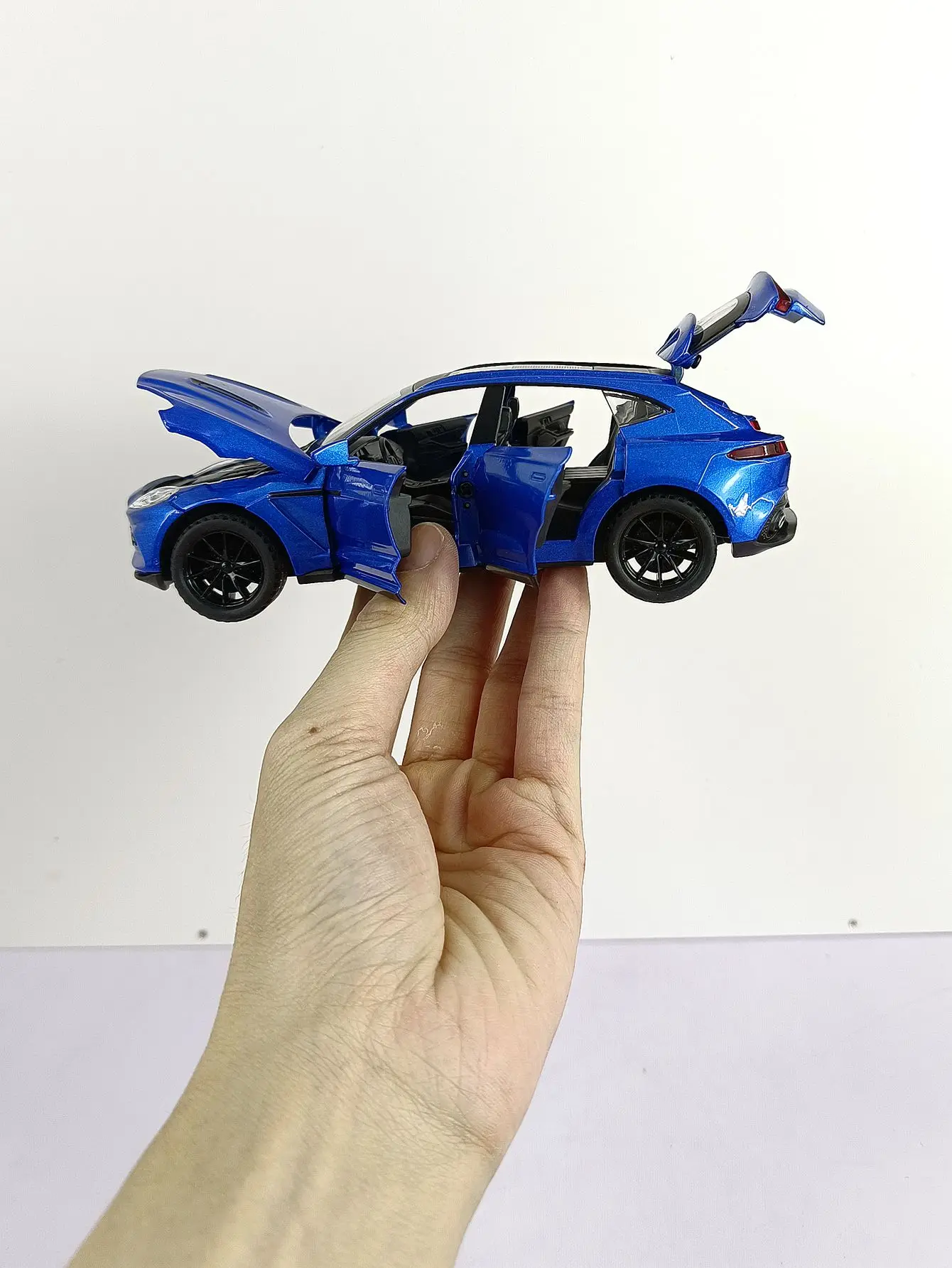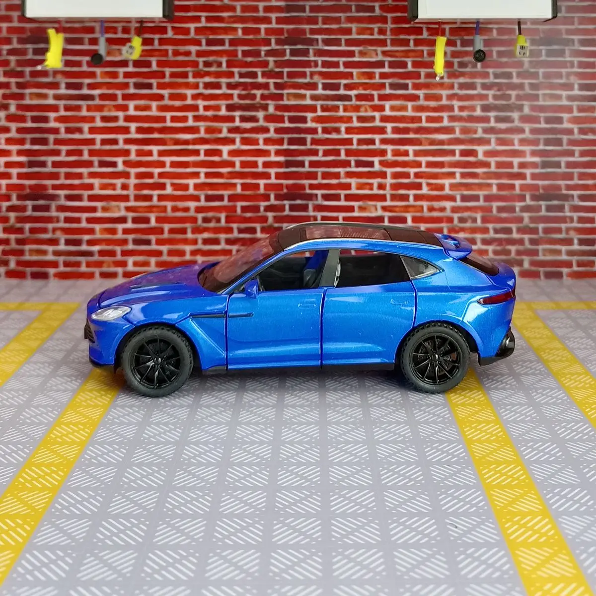 This 1/32 scale diecast Aston Martin DBX SUV miniature model is crafted from metal, featuring a sleek, glossy black finish that highlights its aerodynamic design, detailed headlights, taillights, and front grille. Available in black, green, and blue, this collectible item boasts multi-spoke rims with a matte black tone and tires with realistic tread patterns. Its compact size and refined craftsmanship make it perfect for display, gifting, or adding a touch of luxury to your collection. Certified with a CE certificate and made without high-concern chemicals or batteries, this model offers a sophisticated and authentic aesthetic for adult collectors and enthusiasts.