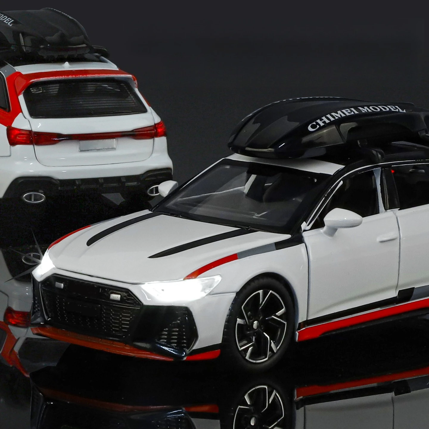 Step into the world of high-performance vehicle modeling with this highly detailed 1/32 scale RS6 Avant station wagon. Crafted from durable metal, this model captures the sleek, sporty essence of the original with precision. Its vibrant white finish is accented by bold red stripes along the sides and rear, complemented by black detailing that enhances its aerodynamic design. The large honeycomb grille and angular headlights give a sense of speed and agility, while the black window trim and white side mirrors add modern sophistication. The model boasts realistically styled black and silver alloy wheels with low-profile tires, and a rounded black roof box mounted on top adds an outdoor racing vibe. Functional light and sound features operated by a button battery elevate its realism, perfect for avid collectors and enthusiasts.