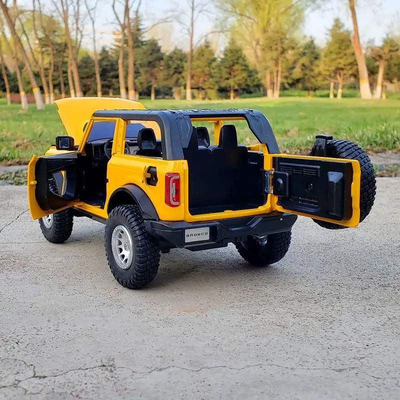The 1/32 Ford Bronco Lima Alloy Car Model is a meticulously crafted diecast metal toy, showcasing a striking grey finish with a glossy sheen. This rugged SUV model features a prominent black grille with “BRONCO” embossed, realistic round headlights, and robust off-road tires with a pronounced tread pattern. Its design is enhanced by black fender flares and a sporty blue graphic on the side. The interior, visible through the open windows, boasts a minimalistic molding that mimics a real vehicle. Constructed with durable diecast metal and plastic, this model is perfect for collectors and enthusiasts alike.