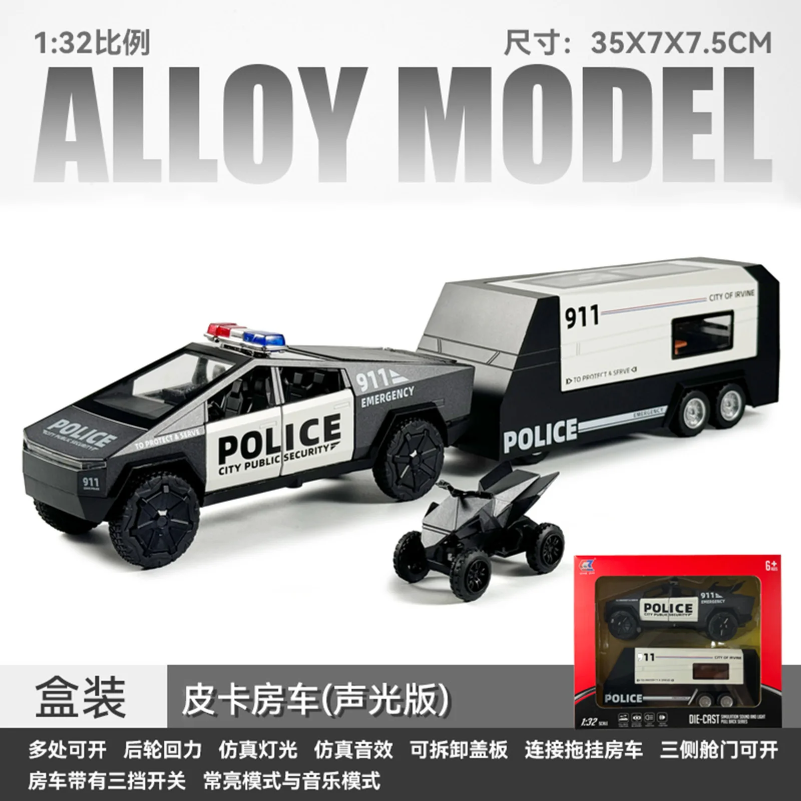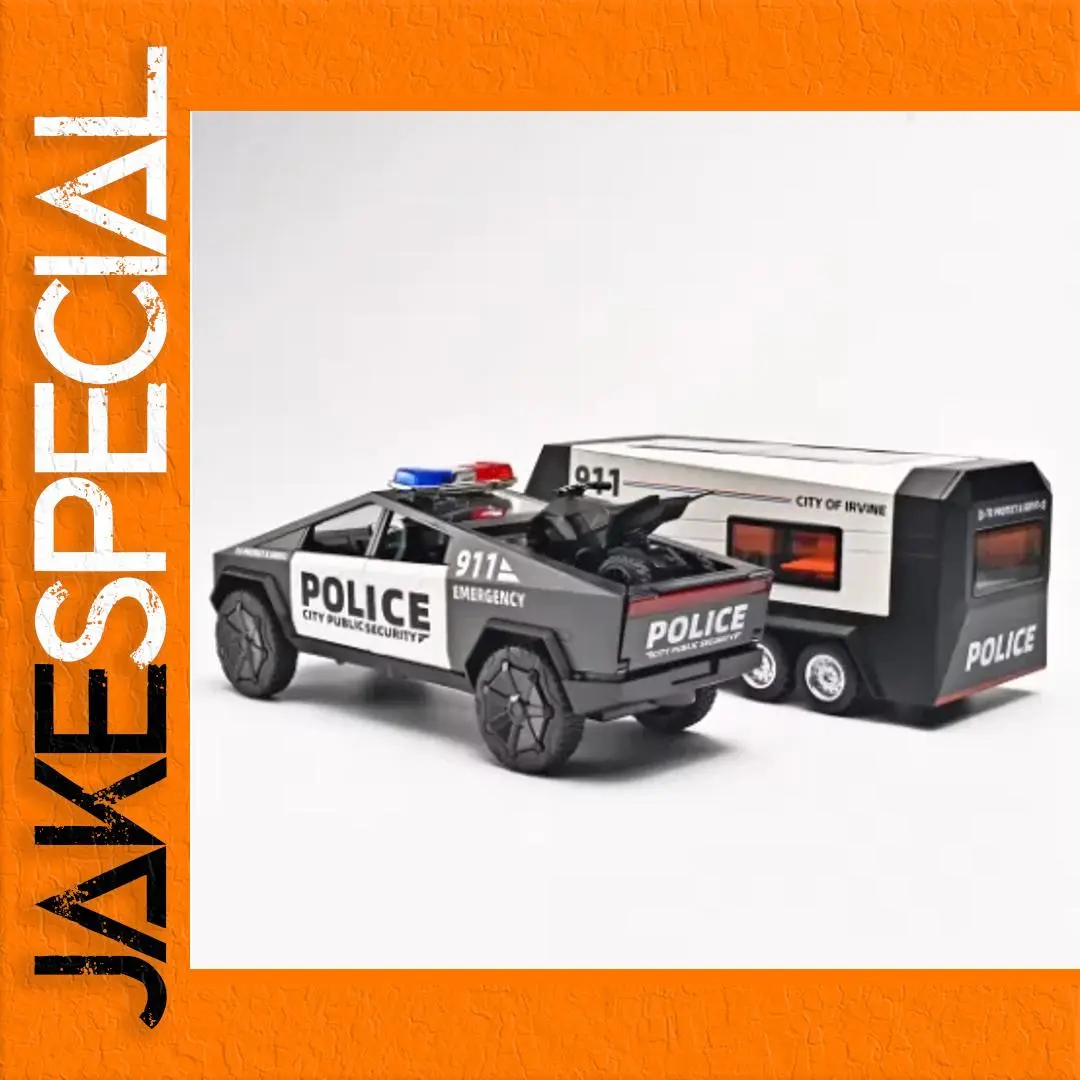 Experience the realism of law enforcement with this detailed 1/32 scale die-cast police vehicle set. The sleek metallic grey finish is highlighted by bold black and white decals displaying “POLICE,” “EMERGENCY,” and “911,” while the stylish light bar with red and blue lights adds authentic detail. Included are a police car, a pickup truck, a motorcycle, and an RV police trailer labeled “CITY OF IRVINE,” all crafted from durable metal for lasting enjoyment. Perfect for collectors or enthusiasts aged 14 and older, this set offers a stylish and realistic display of modern police vehicles. Available with or without a box.