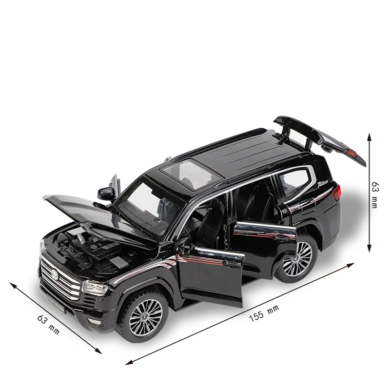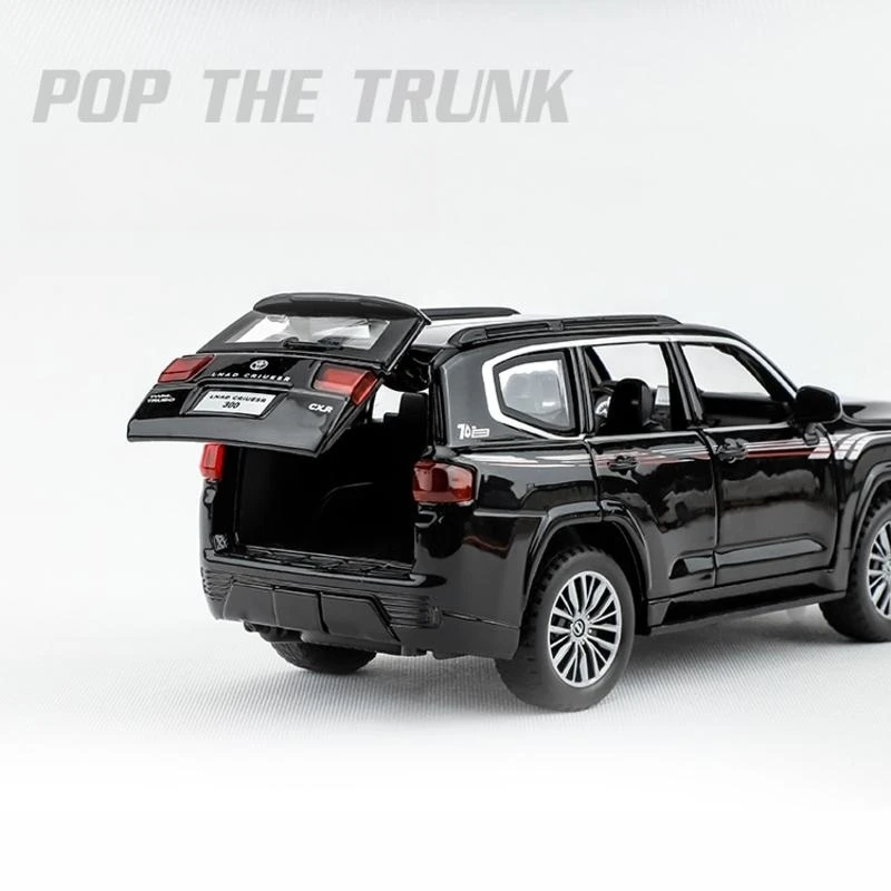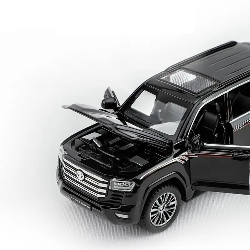 Experience the thrill of owning a highly detailed miniature of the Toyota Land Cruiser LC300 with this meticulously crafted diecast model. Finished in a sleek, glossy black, it captures the modern styling and premium look of the actual vehicle. The model features realistic sculpted body lines, a prominent grille with chrome accents, and detailed LED-style headlights—bringing an authentic touch. Its multi-spoke alloy-style rims and subtle roof rails boost the realism. Functional parts include openable doors, hood, and rear hatch, revealing detailed interiors and engine compartment. Equipped with sound and light features, this collectible offers an immersive experience. Made from high-quality metal, it's perfect for enthusiasts who appreciate craftsmanship and detail. A must-have for collectors and passionate fans alike.