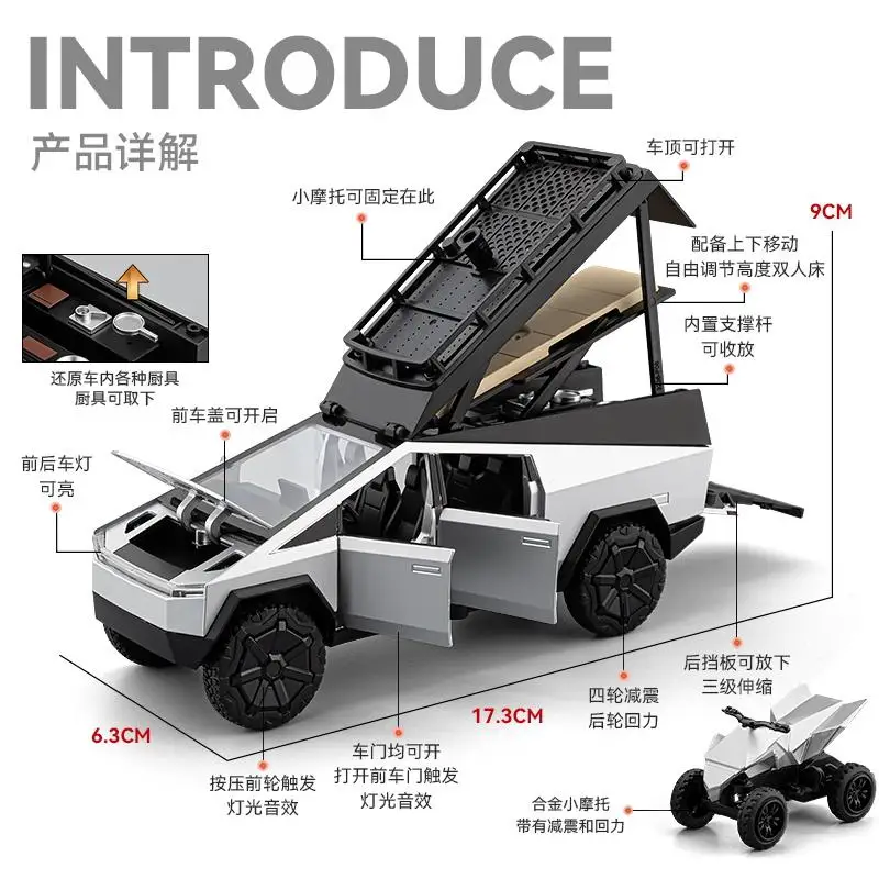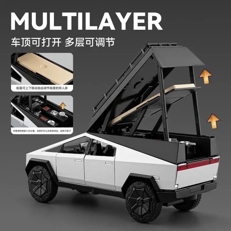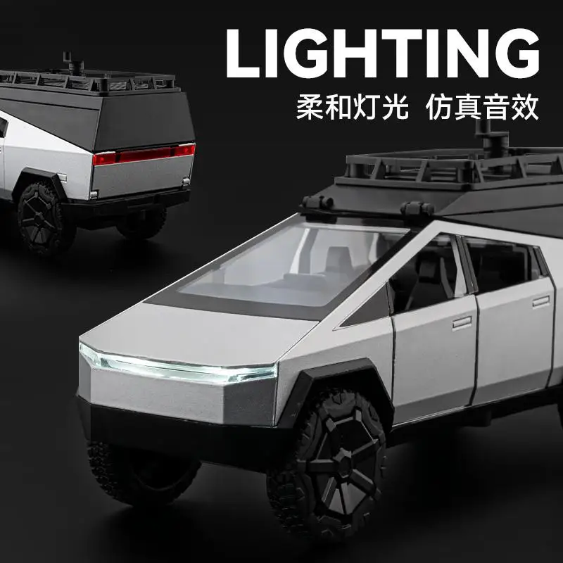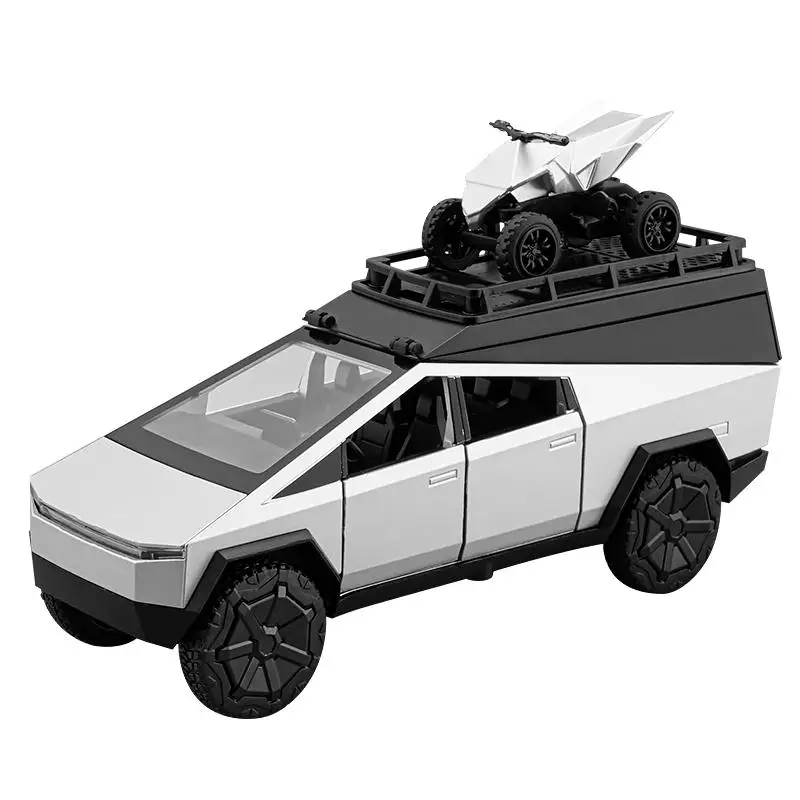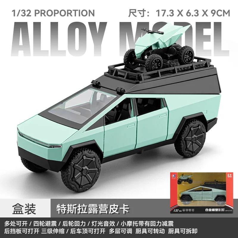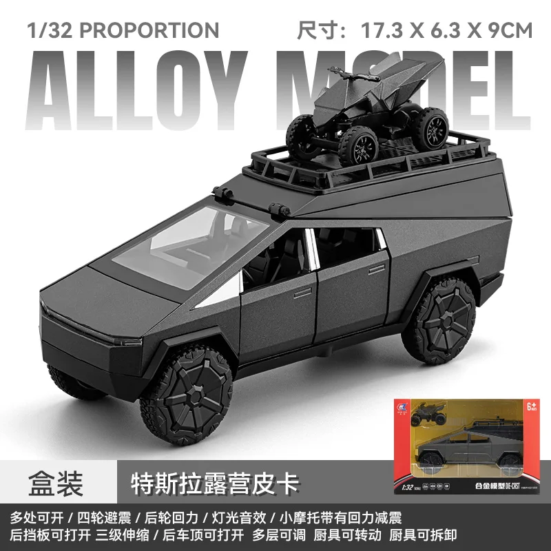 Step into a world of imaginative play or collector’s display with this highly detailed 1/32 scale model of a silver pickup truck with an attached camper RV. Crafted from durable alloy, the toy features a sleek, modern design with angular lines, a boxy shape, and realistic black accents. Its transparent windows and flat-hinged roof add to the authenticity, while the large rugged wheels ensure stability and rugged off-road appeal. The camper's rectangular shape with rounded edges and a sloped roof topped with a creative animal figure in white contribute a playful, eye-catching aesthetic. This miniature offers an engaging blend of realism and fantasy, making it perfect for young enthusiasts and serious collectors alike.