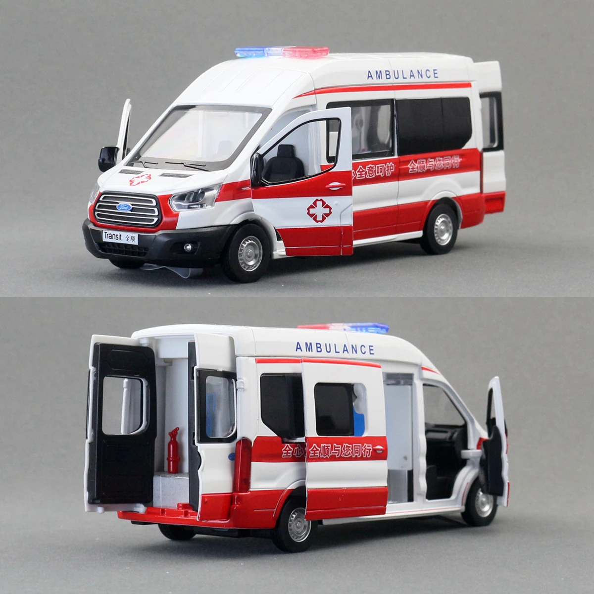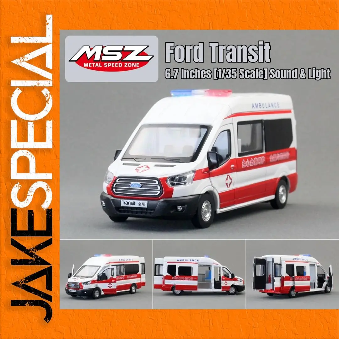 This highly detailed 1/35 scale diecast model of a Ford Transit ambulance measures approximately 17-18 cm in length and features a polished white body accented by bold red stripes, medical insignias, and Chinese characters for an authentic appearance. The model boasts a chrome front grille with horizontal bars, clear plastic headlights, and detailed side mirrors. A vivid red and blue emergency light bar on the roof enhances its striking visual appeal. Constructed from durable diecast metal, it includes textured tires with silver hubcaps, a highly detailed interior visible through the transparent windshield, and functional features such as pull-back motion, sound effects, and flashing lights powered by batteries, making it perfect for collectors and display.