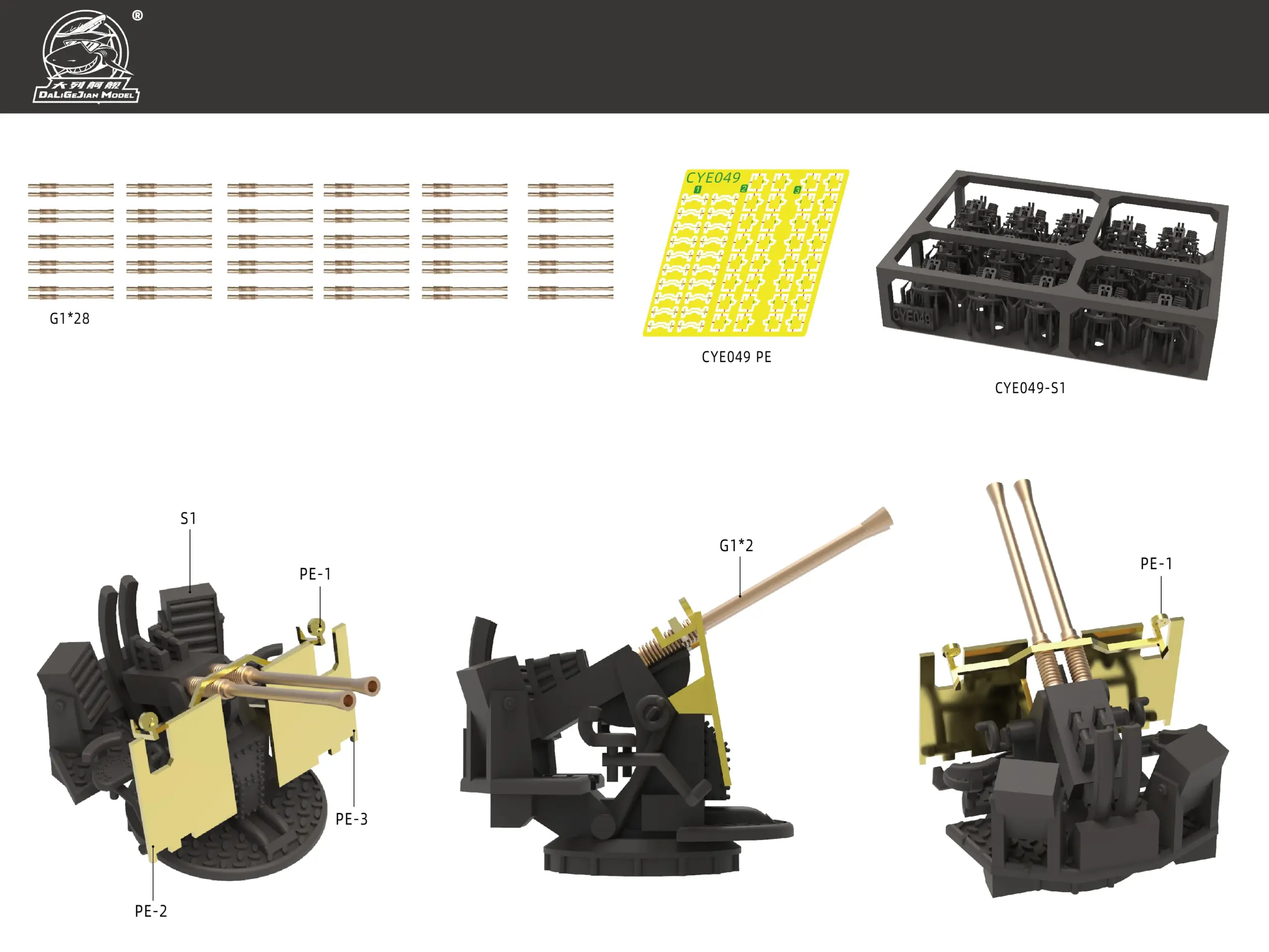 - Components include bases, shields, barrels, and structural parts marked with labels like ‘S1,' ‘PE-1,' ‘PE-2,' and ‘PE-3' for easy identification.
