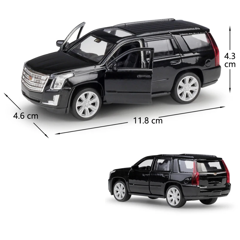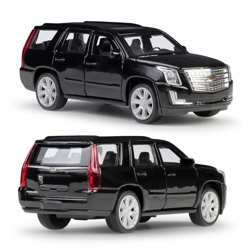 Experience the thrill of owning this high-quality diecast miniature of a Cadillac Escalade SUV. Crafted with attention to detail, this model boasts a sleek black finish with a glossy exterior that enhances its sophisticated look. Its boxy, angular shape mimics the real vehicle perfectly, featuring a sloped front hood, intricate chrome accents on the grille and bumper, and transparent windows revealing finely detailed interior components. The side mirrors, door handles, and panel lines add to its authentic appearance. The roof includes a subtle textured pattern resembling roof rails, while the silver multi-spoke wheels with black tires spin freely, adding playability and realism. This model is perfect for collectors and enthusiasts who want a durable, visually striking display piece.