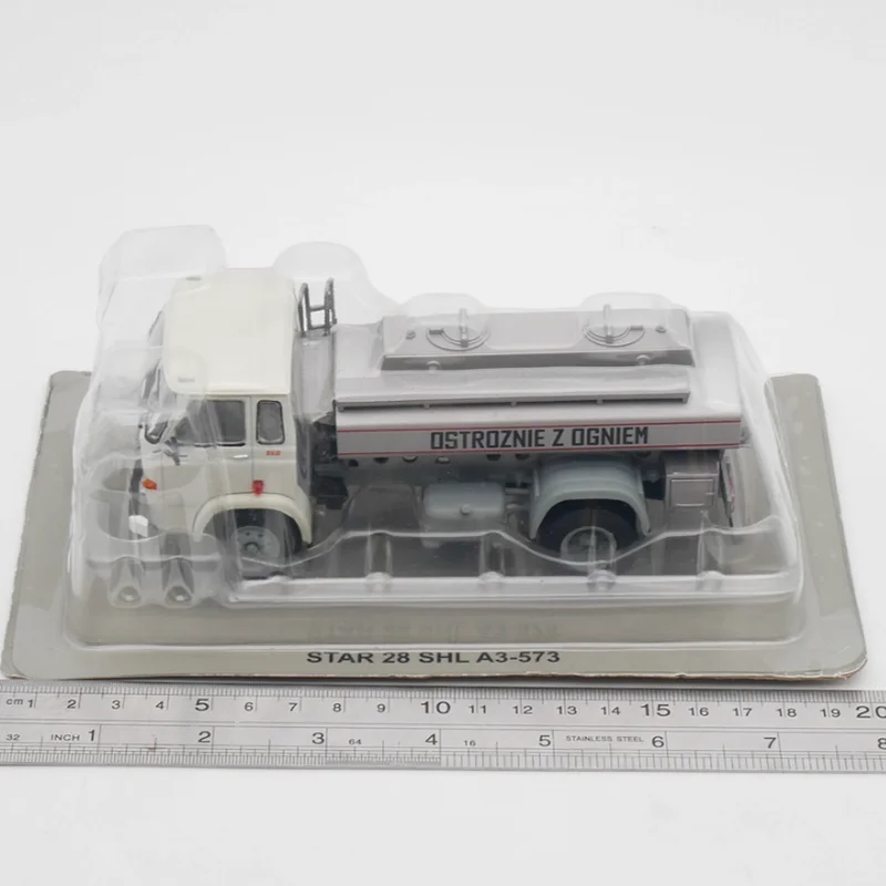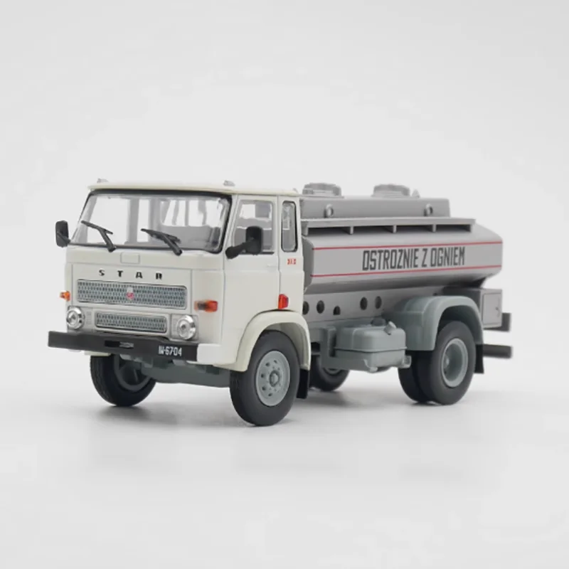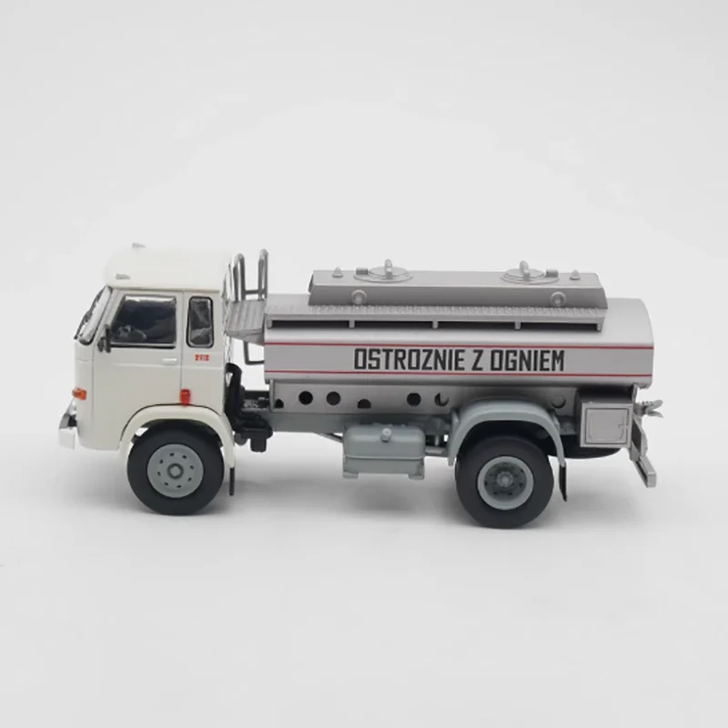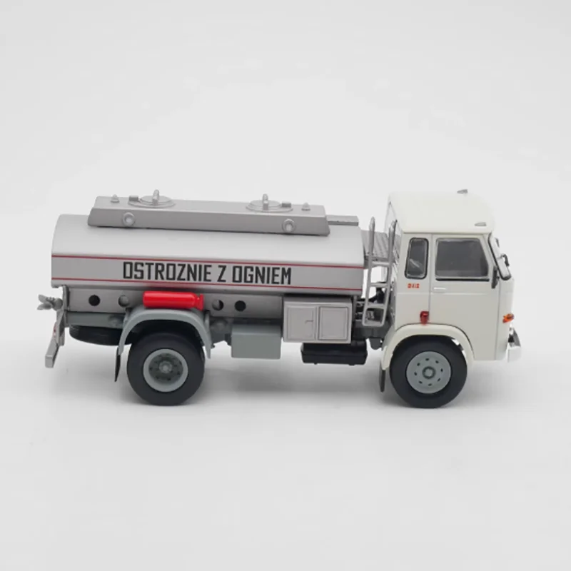 This highly detailed 1/43 scale diecast alloy oil tanker model features a cylindrical metallic silver finish with black and red warning text, realistic piping, vents, and structural support beams. The cab exhibits a classic, boxy design in a neutral white or off-white color, with detailed grille, large rounded headlights, orange indicator lights, clear windows with windshield wipers, and subtle door handles. Designed for adult collectors, it is a static ornament crafted from alloy and plastic, measuring approximately 1:43 in scale with manually measured dimensions, perfect for display and gifting purposes. Not suitable for children under 14, this model offers a realistic industrial aesthetic.