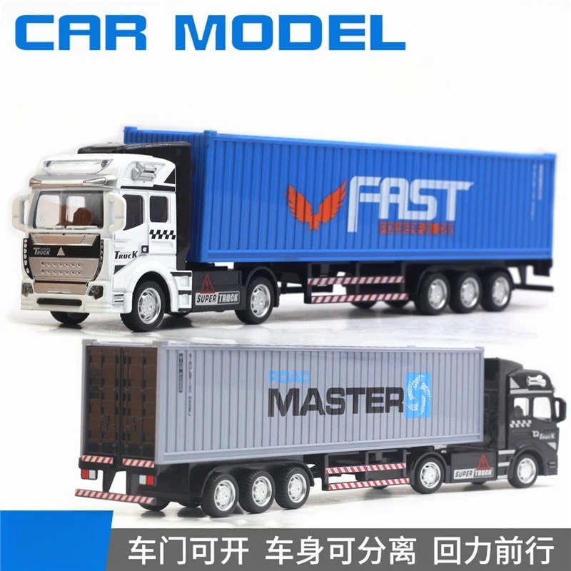 Experience the charm of this highly detailed 1/48 scale diecast container truck, designed as a windup toy that feels solid and authentic. Its sleek black tractor unit features contrasting white and red accents, including checkered patterns on the sides and front, creating a bold, modern look. The transparent windows reveal a finely crafted interior, while the chrome-like grille, side mirrors, and headlights add realism. Attached to the tractor is a large gray container trailer with the “MASTER” logo in black and blue, complemented by a striking blue circular design. The brightly colored containers in shades of blue, yellow, red, and gray showcase ribbed textures, mimicking real-life shipping containers. Carefully molded with durable diecast metal, this collectible toy emphasizes quality, finesse, and industrial style.