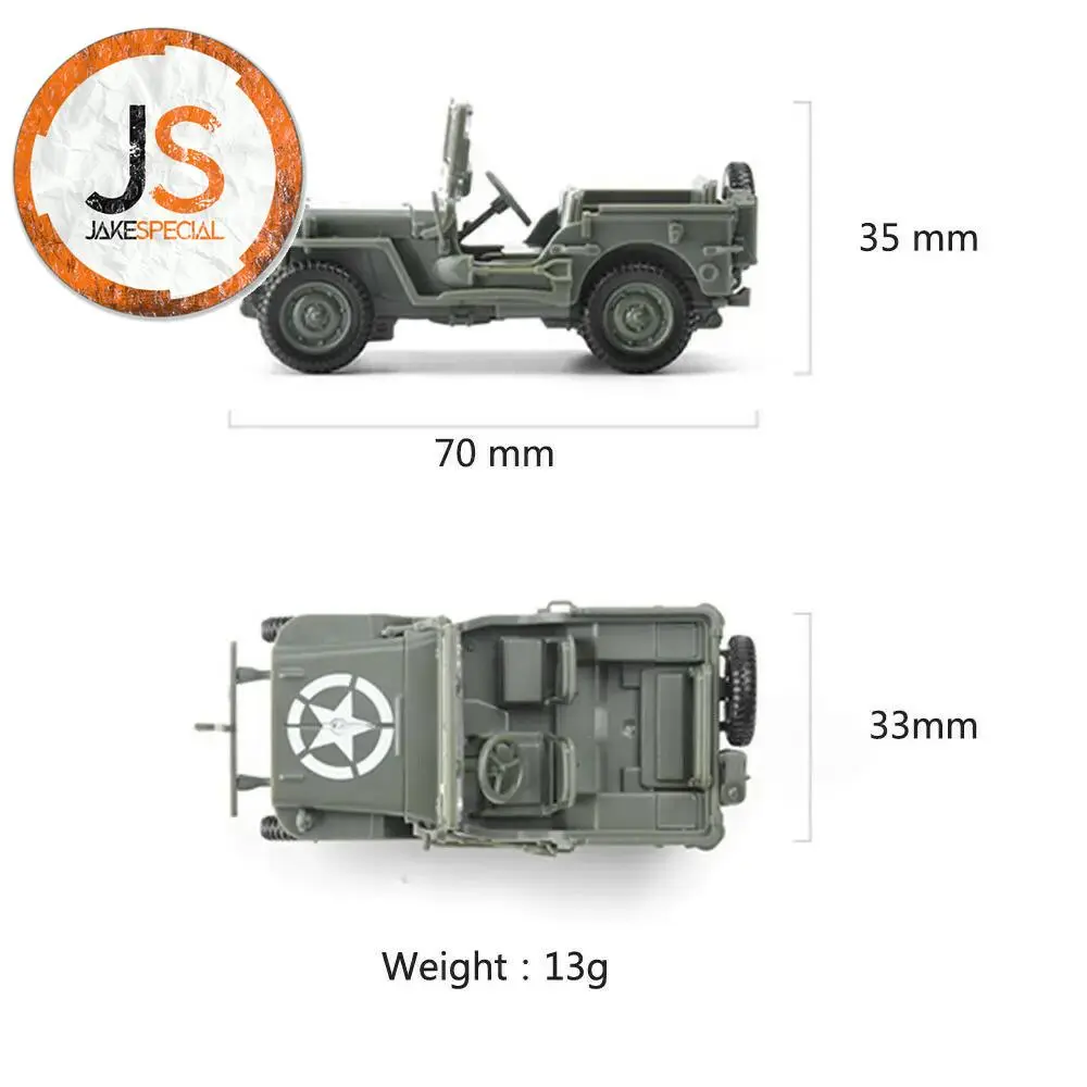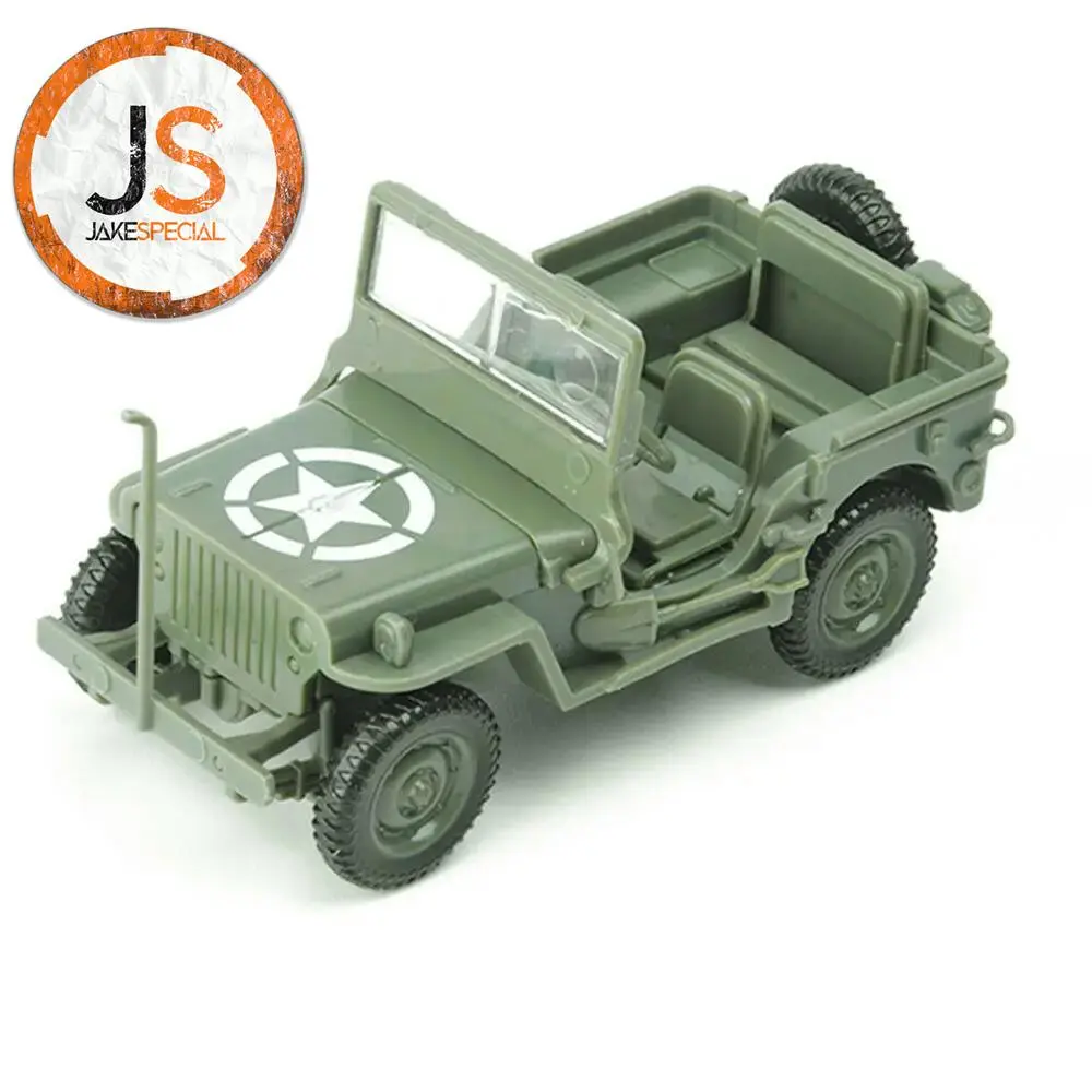 Picture yourself as the proud owner of this exquisite 1/48 scale US Willys Jeep model, designed for assembly and perfect for enhancing your collection. Its authentic World War II aesthetic, featuring a classic military green and a charming light brown variant, brings history to life. Crafted from durable PVC plastic, this model is textured for realism and showcases the iconic Jeep design, complete with a star emblem on the hood. The model fits effortlessly into your hand, making it ideal for display or imaginative play with plastic soldiers. Enjoy the satisfaction of assembling this delightful vehicle and watch your collection thrive.