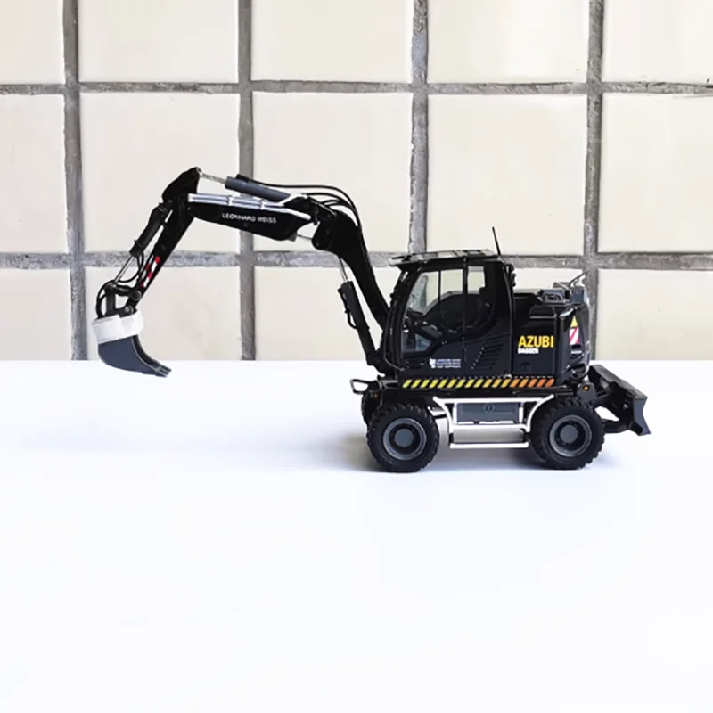 - Bold black main body contrasted with a light-colored arm and bucket, emphasizing realism and visual interest. The detailed markings, decals, and hydraulic lines enhance the miniature industrial aesthetic.
