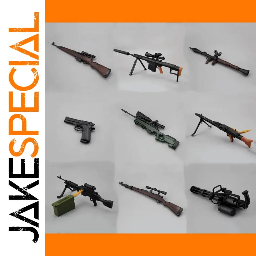 Step into an immersive military display with this detailed 1/6 scale assembly model featuring an array of authentic weapon accessories. Crafted from durable PVC plastic, this set includes intricately designed models such as the iconic Gatling gun, the powerful M82A1 sniper rifle, and the classic Desert Eagle pistol. Each piece showcases realistic finishes with matte black, metallic gray, and vibrant orange accents, emphasizing true-to-life detail and craftsmanship. Suitable for ages 12 and above, the set encourages assembly and educational exploration of military weaponry. Perfect for collectors and enthusiasts, this kit allows you to create an engaging and visually striking military scene or diorama that highlights tactical realism and fine craftsmanship.